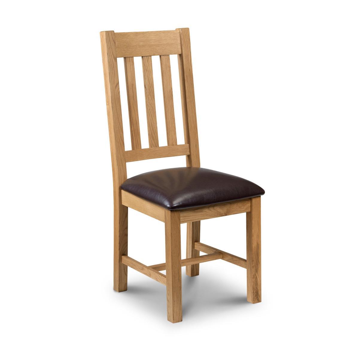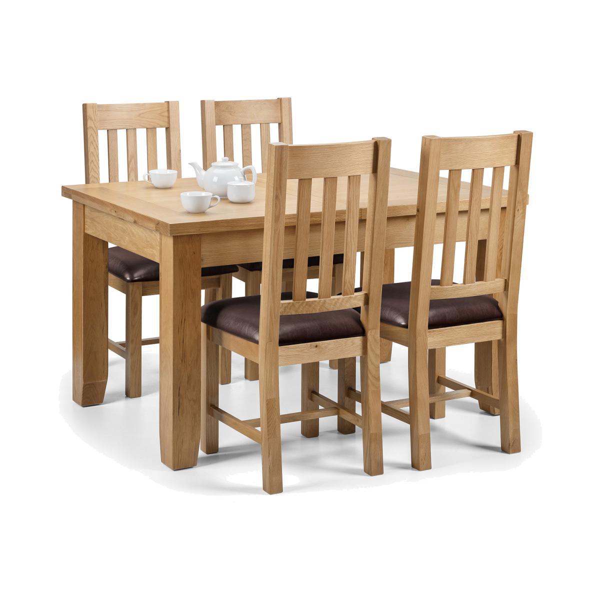 The Astoria dining set boasts a classic design with a chunky 40mm thick top in a sumptuous Waxed Oak finish. Made from the finest white oak and oak veneers, the Astoria features a 40cm butterfly extension system that is stored within the table when not in use. ? This set comes complete with four matching solid oak dining chairs with comfortable and easy to care for faux leather seatpads.