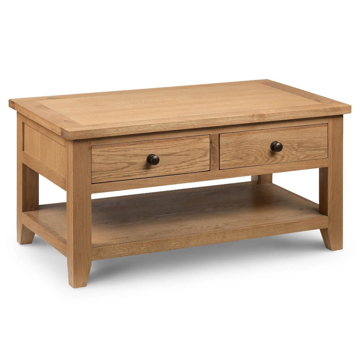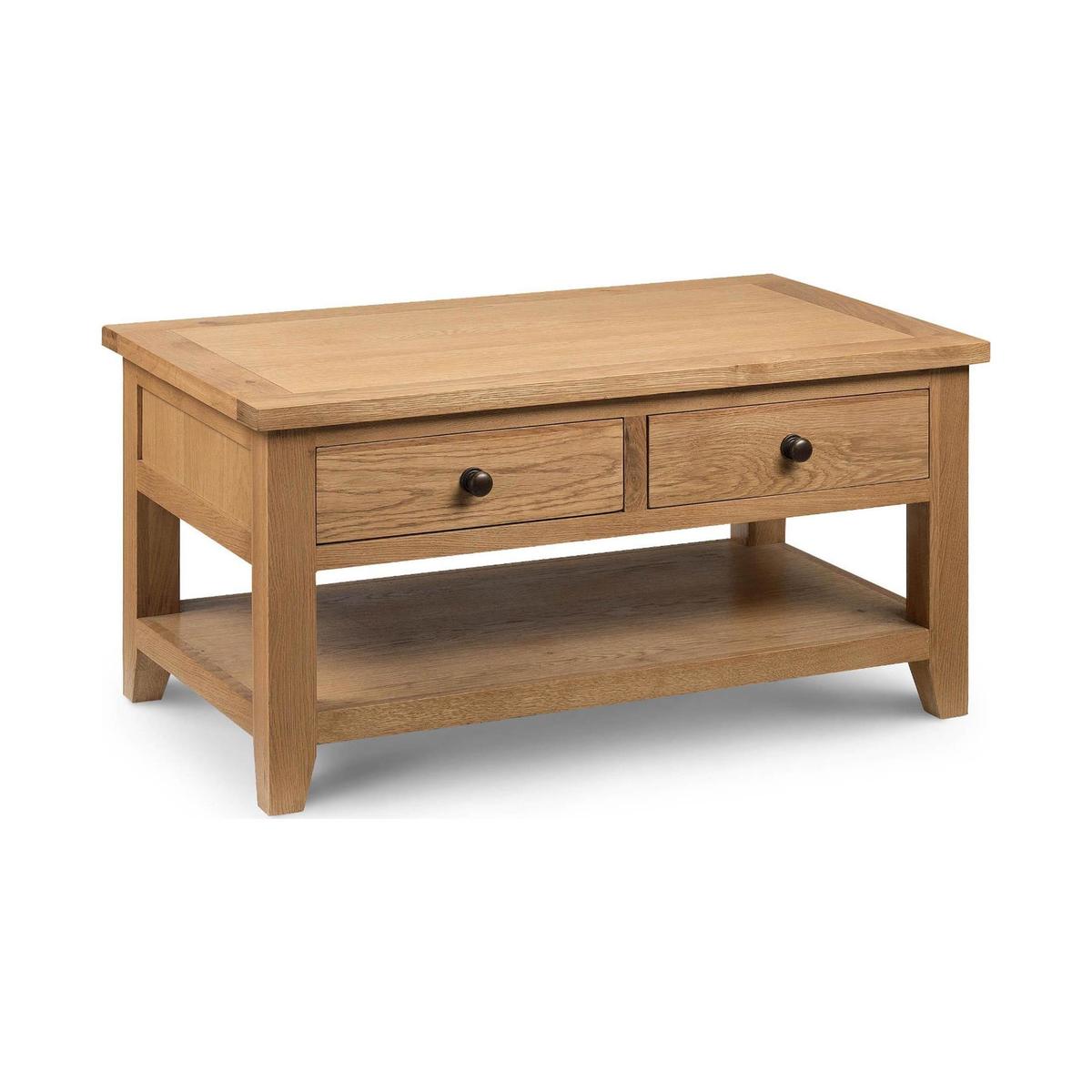I love this coffee table for its classic, versatile design and warm oak finish, which pairs effortlessly with both contemporary and traditional interiors. It works particularly well in relaxed living rooms or country-style spaces where its natural wood tone can add a cozy touch. Practical styling tips include using the surface for minimal decorative accents like a vase or a tray, while the lower shelf can be utilised for storage baskets or books to keep the space tidy. The drawers are handy for stashing remote controls or smaller items out of sight, making this a functional yet stylish addition to any lounge.