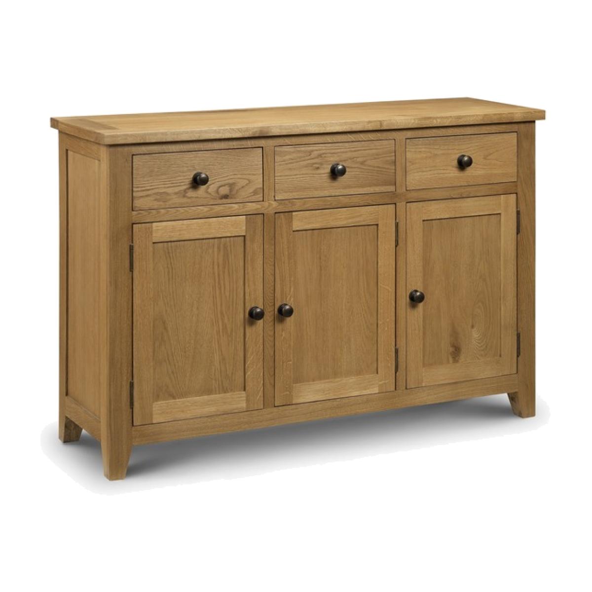 The Astoria Sideboard is crafted from White Oak and Oak Veneers with a durable waxed finish. The perfect storage unit for the modern living or dining room, incorporating 3 drawers above a double and single cupboard space. A timeless design with chunky tops that complements contemporary and traditional interior styles equally well. With a range of coordinating furniture from the Julian Bowen Astoria range to create a warm, traditional feel in your home.