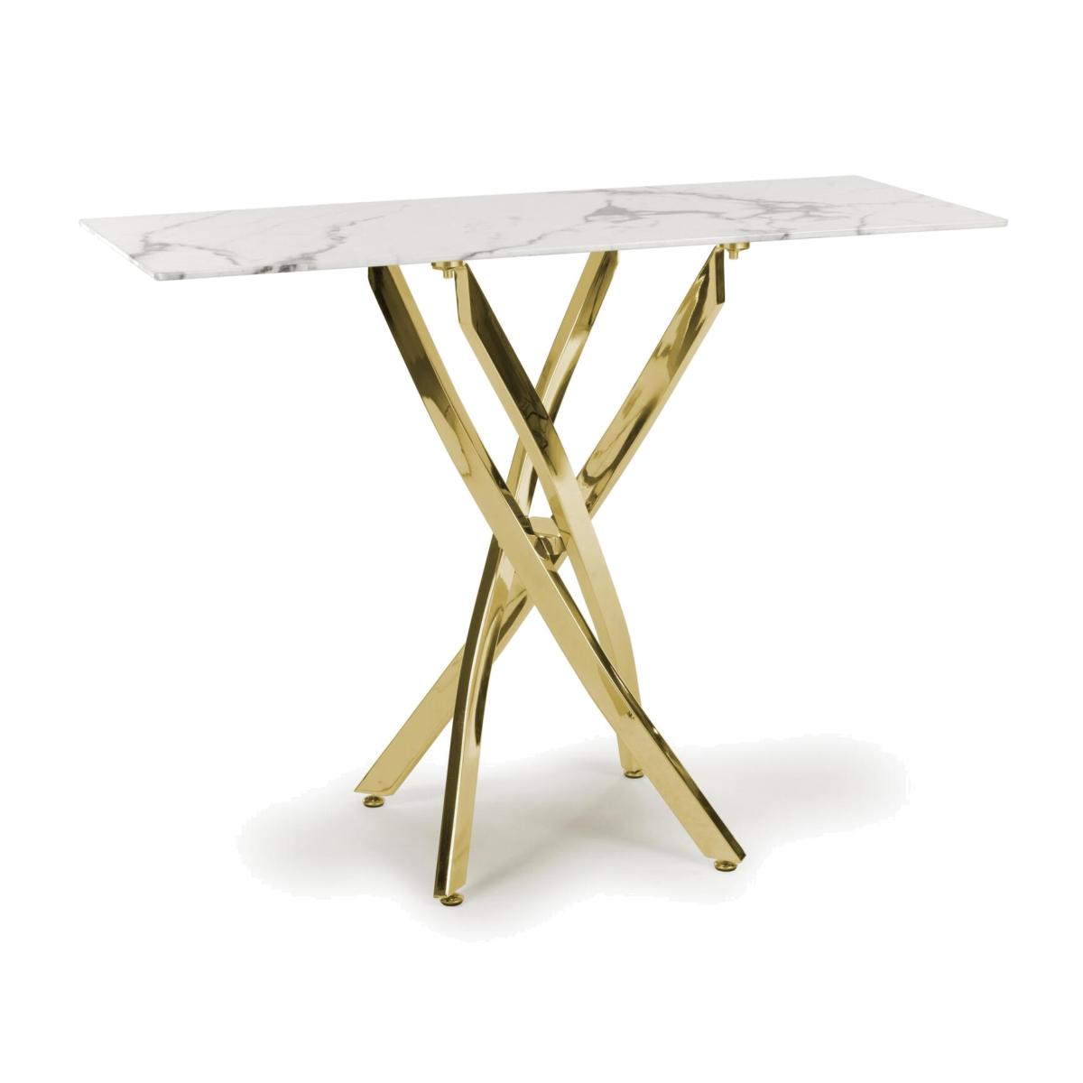 This eye catching rectangular console table adds a touch of glamour to any room. The heat and stain resistant top comes in a white and grey marble effect print finish. The gold/chrome support frame features 4 wrapped around legs to create a stunning base, with adjustable legs. Assembly required. Sold individually.