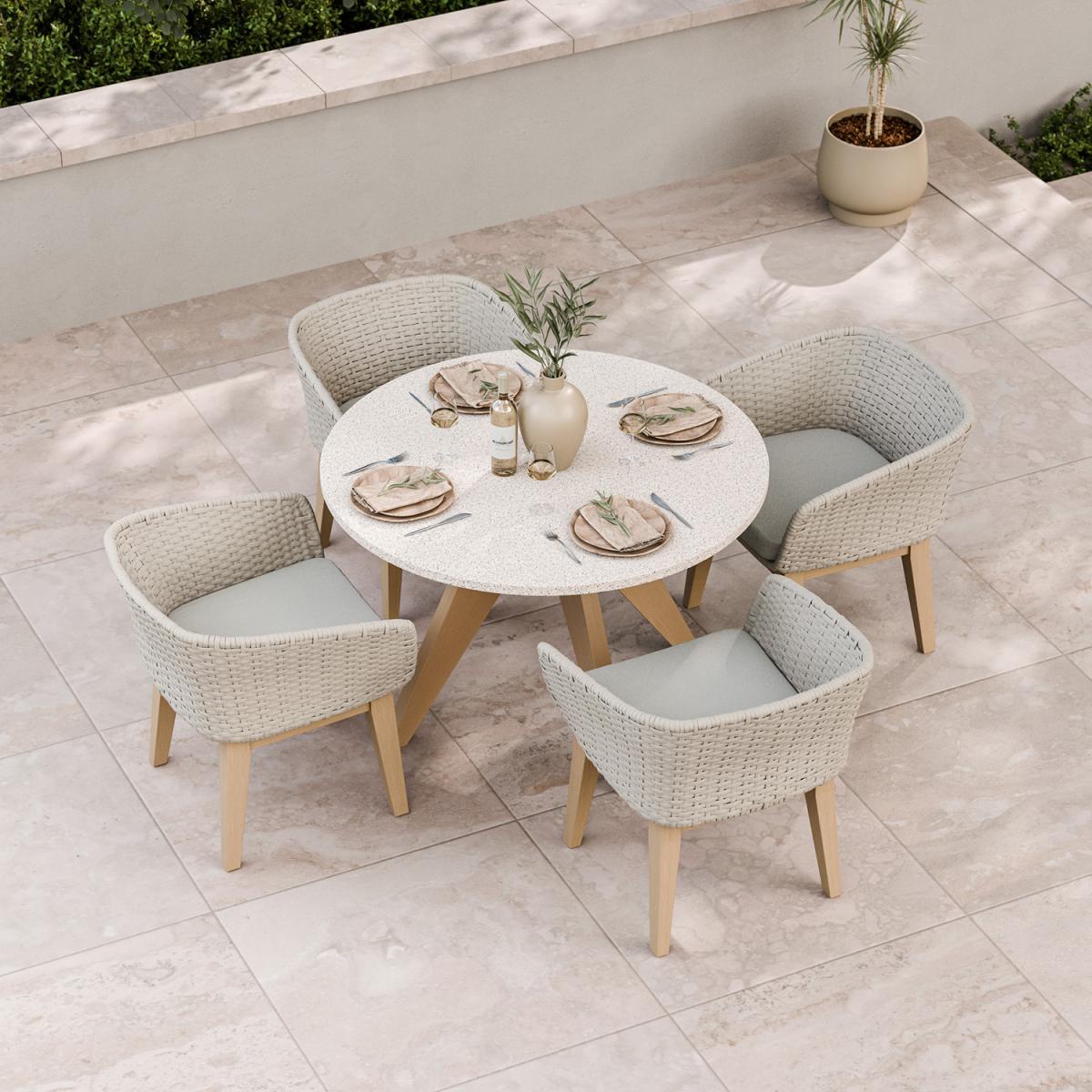 Astral 4 Seater Concrete Terrazo Dining Set with choice of chair style. The FSC 1 Astral 120cm Round Concrete Terrazzo Table is a striking piece that blends modern design with natural materials. The table features a soft cream terrazzo top with multi-speckled accents, creating a unique and sophisticated pattern that adds character and texture to any dining space. The concrete terrazzo finish provides a durable yet elegant surface, perfect for both indoor and outdoor settings. Supported by a sleek, sturdy frame, this table offers both style and function in equal measure. Paired with the table are four Eden Dusk Dining Rope Chairs, which combine comfort and contemporary flair. The chairs are crafted with durable rope weave in a refined dusk soft taupe colour, providing both a chic look and ergonomic support. The sleek design of the chairs complements the soft cream hues of the table, creating a balanced and stylish dining ensemble. Whether for a cozy indoor meal or an elegant outdoor gathering, this set offers a modern, sustainable solution for stylish dining.