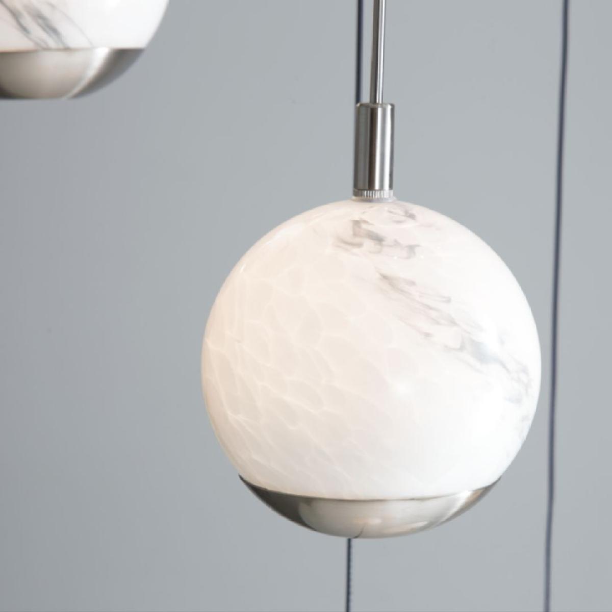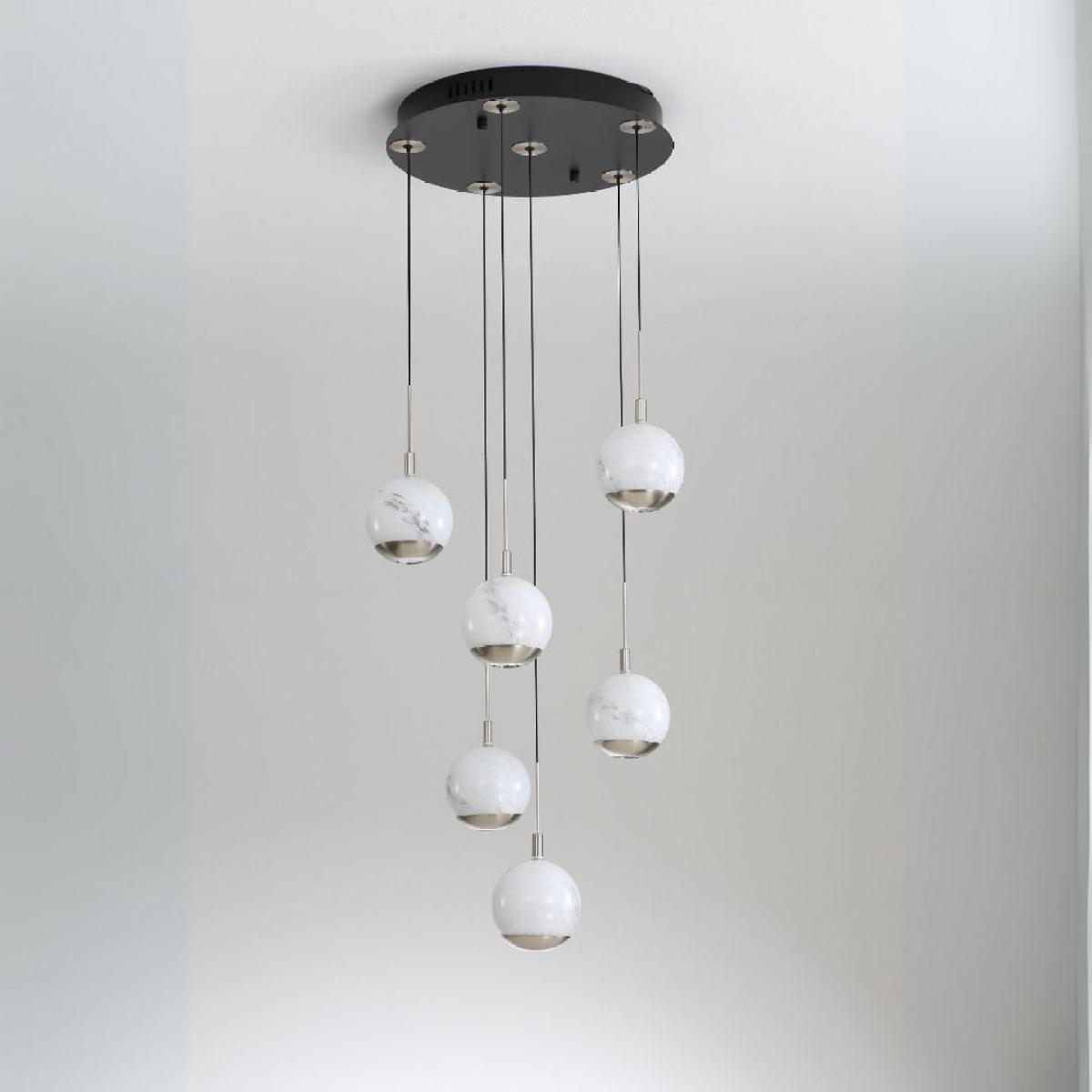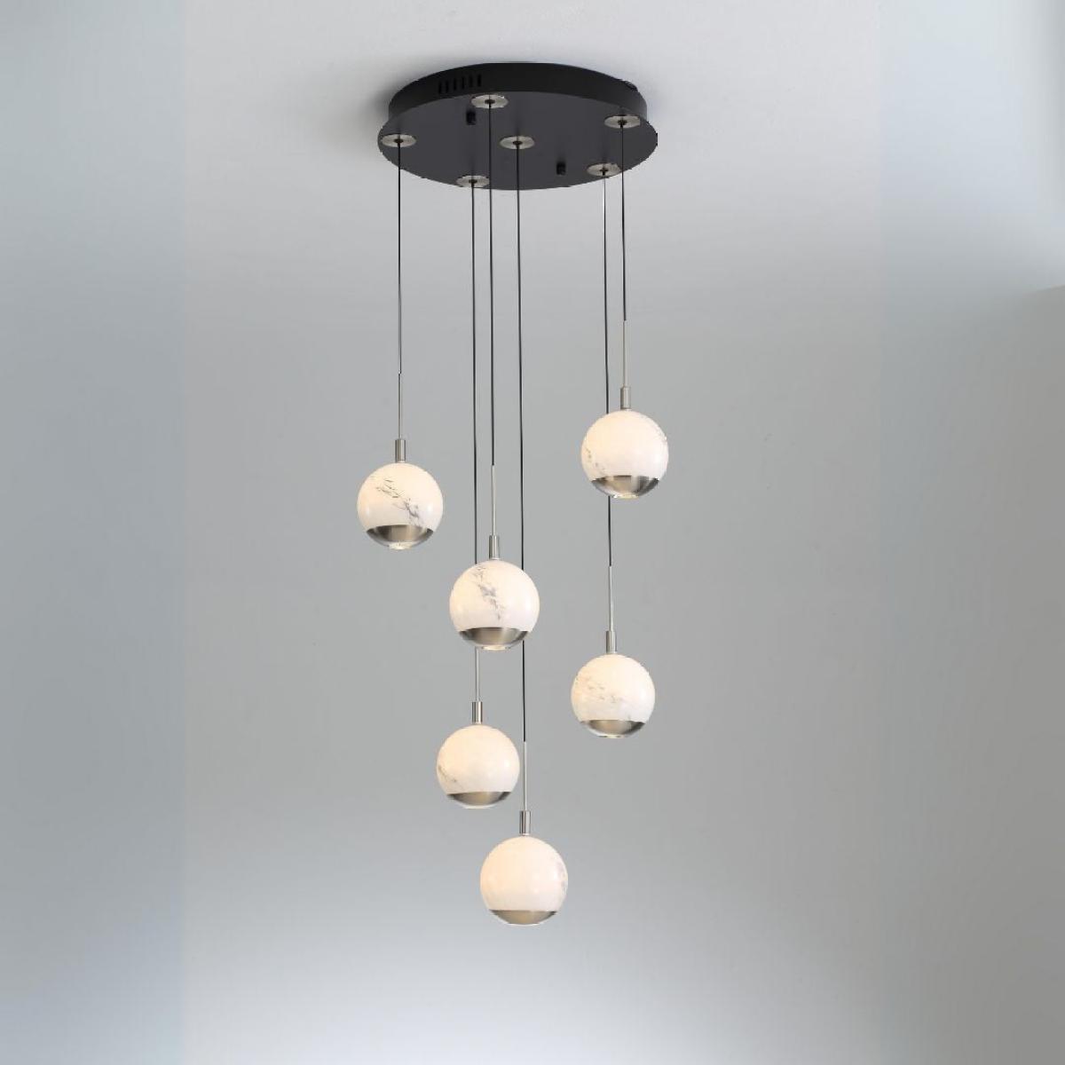 Astrid 6-light multi-drop LED pendant, featuring white, marble-effect spherical glass pendants, with satin chrome accents and a matte black ceiling plate. The Astrid 6-light multi-drop pendant is a stylish fusion of modern design and luxurious materials. Featuring six white, marble-effect glass spheres, this pendant brings a sophisticated touch to any space. The spherical pendants are beautifully complemented by satin chrome accents, which add warmth and elegance, while the matte black ceiling plate provides a sleek, contemporary contrast. Perfect for hanging over dining tables, in living areas or entryways, the Astrid pendant creates a striking visual statement. The staggered drop heights of the pendants add a dynamic, layered effect, while the integrated LED lights ensure energy-efficient illumination with a soft, inviting glow. This multi-drop pendant is the ideal choice for those looking to blend modern minimalism with a hint of luxury. Astrid 6-light multi-drop LED pendant, featuring white, marble-effect spherical glass pendants, with satin chrome accents and a matte black ceiling plate. The Astrid 6-light multi-drop pendant is a stylish fusion of modern design and luxurious materials. Featuring six white, marble-effect glass spheres, this pendant brings a sophisticated touch to any space. The spherical pendants are beautifully complemented by satin chrome accents, which add warmth and elegance, while the matte black ceiling plate provides a sleek, contemporary contrast. Perfect for hanging over dining tables, in living areas or entryways, the Astrid pendant creates a striking visual statement. The staggered drop heights of the pendants add a dynamic, layered effect, while the integrated LED lights ensure energy-efficient illumination with a soft, inviting glow. This multi-drop pendant is the ideal choice for those looking to blend modern minimalism with a hint of luxury.