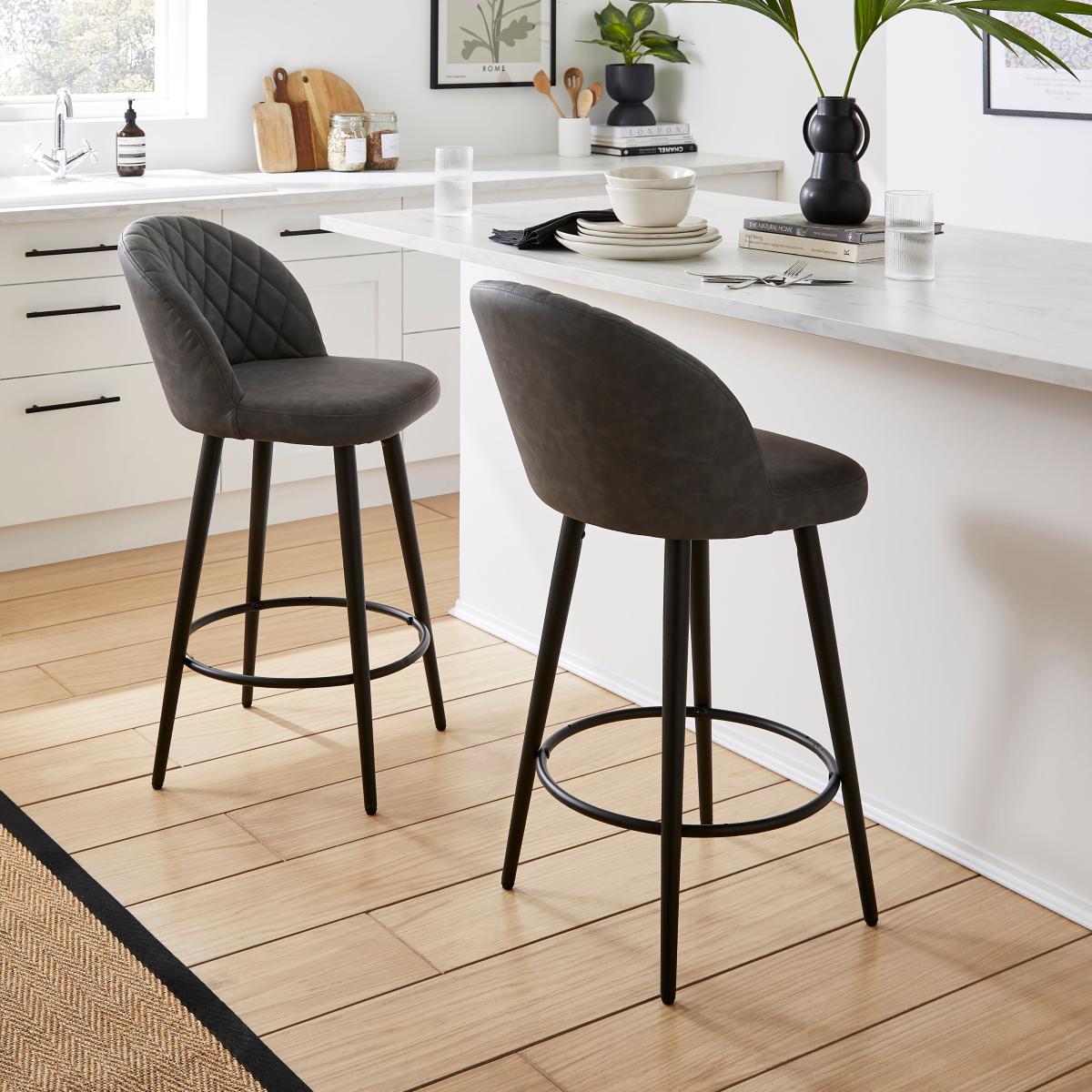 Dunelm Exclusive - Designed and Developed by Dunelm* Sturdy bar stool* Faux leather upholstery* Mechanism to alter stool’s height* Part assembly required Whether you're creating a cosy bar area or revamping your kitchen counter seating, This leather bar stool is a stylish and practical choice. The quilted detail on the seat adds a tasteful touch of elegance, creating a visually striking look that catches the eye. The foam-filled seat offers a plush cushioning experience, ensuring optimal support, making it ideal for long periods of sitting. Sink into its softness as you unwind or engage in lively conversations with friends and family. Built with a sturdy frame, this bar stool guarantees excellent stability and reliability. Its sleek and streamlined design effortlessly blends into various interior styles, making it a versatile choice for any home decor.