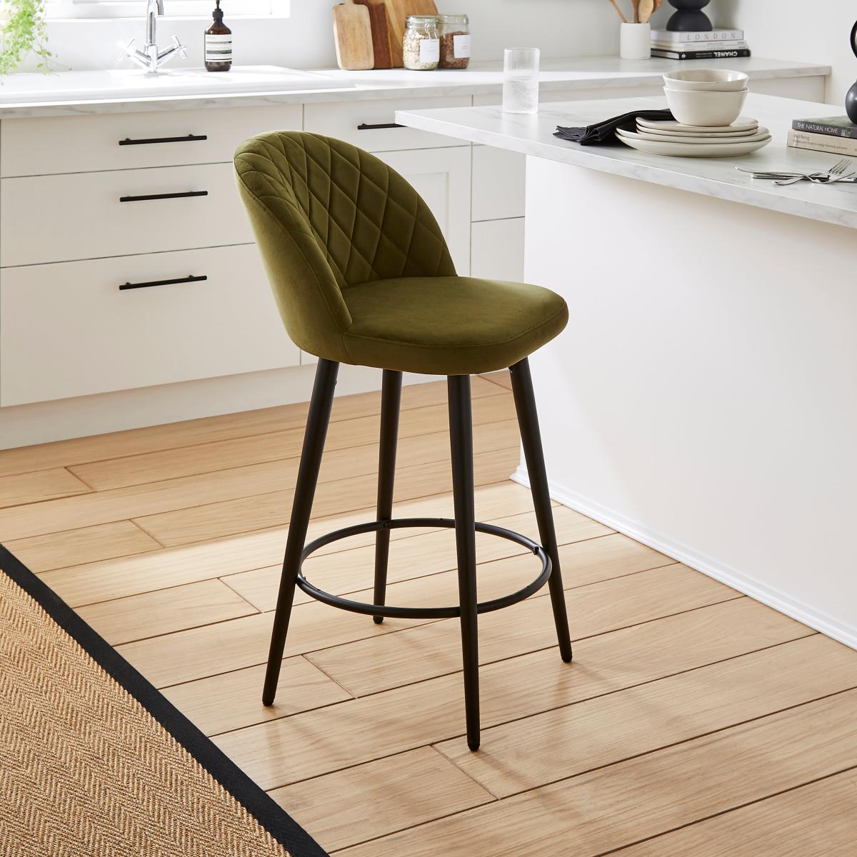 * Sturdy bar stool* Soft, velvet upholstery* Mechanism to alter stool’s height* Part assembly required Whether you're creating a cosy bar area or revamping your kitchen counter seating, this bar stool is a stylish and practical choice. The quilted detail on the seat adds a tasteful touch of elegance, creating a visually striking look that catches the eye. The foam-filled seat offers a plush cushioning experience, ensuring optimal support, making it ideal for long periods of sitting. Sink into its softness as you unwind or engage in lively conversations with friends and family. Built with a sturdy frame, this bar stool guarantees excellent stability and reliability. Its sleek and streamlined design effortlessly blends into various interior styles, making it a versatile choice for any home decor.