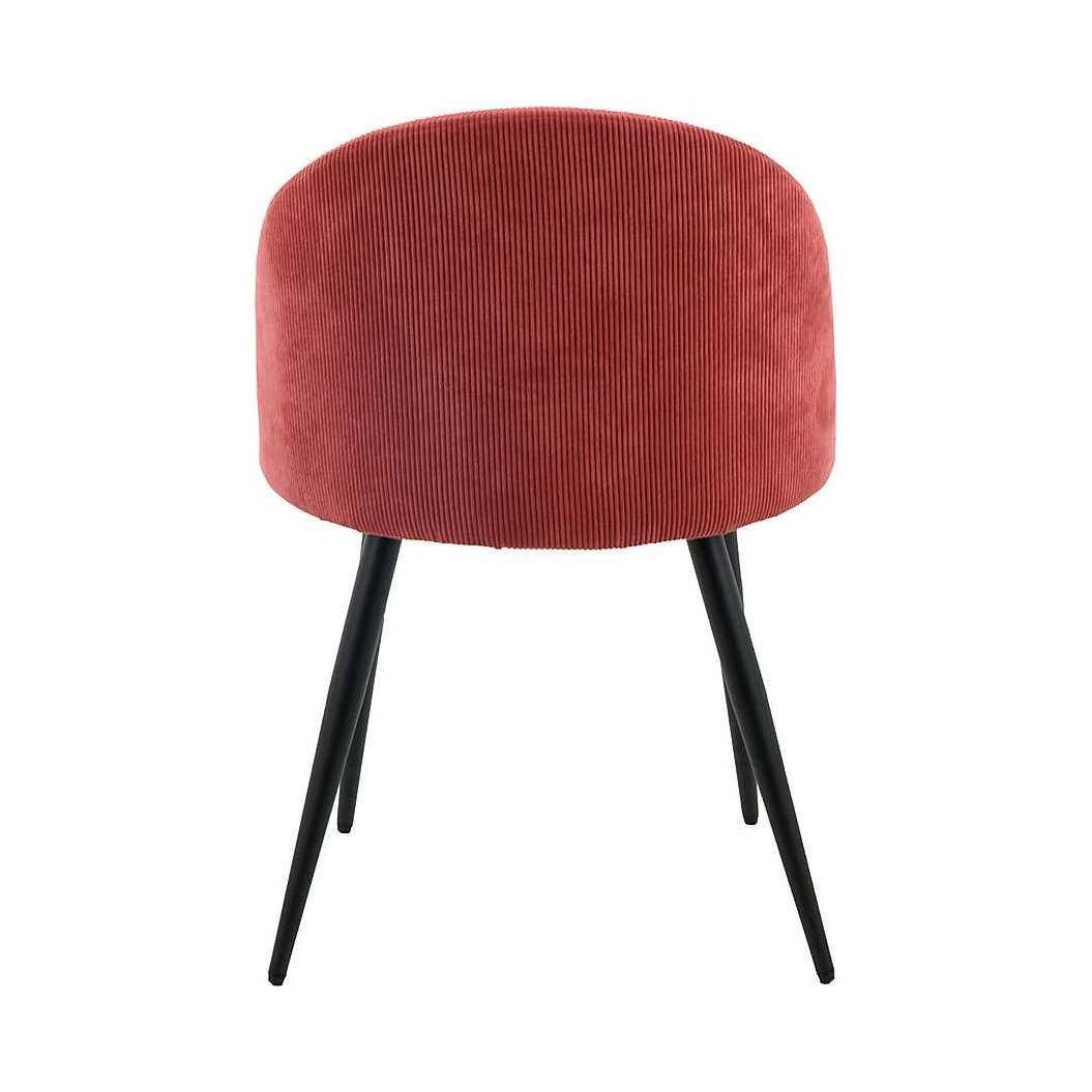 I love this chair for its playful yet sophisticated vibe. The coral cord upholstery adds a warm, inviting touch, making it a versatile choice for both modern and eclectic dining spaces. It works particularly well in interiors with muted tones or neutral palettes, as it can act as a statement piece without overwhelming the room. To style it effectively, consider pairing with a sleek glass or wooden table, and complement with cushions or accessories in complementary colours like soft pinks, greys, or metallic finishes. Its tapered black legs give it a contemporary edge, so it fits perfectly in spaces aiming for a chic, contemporary look. Practical tip: these chairs are durable and comfortable, making them suitable for everyday use or more special occasions.