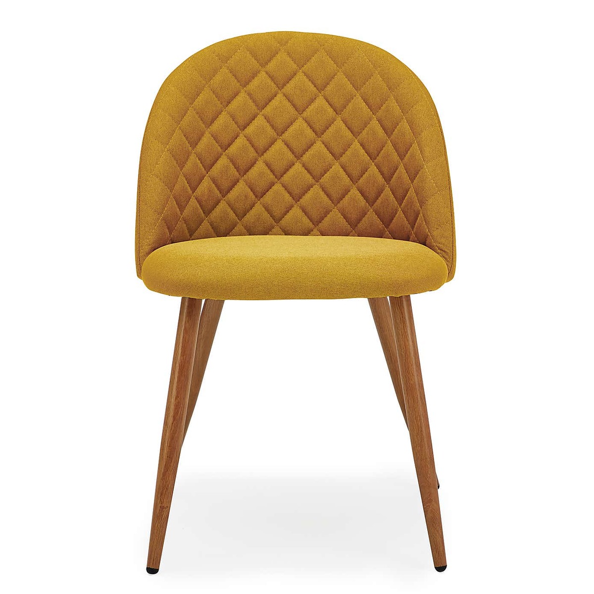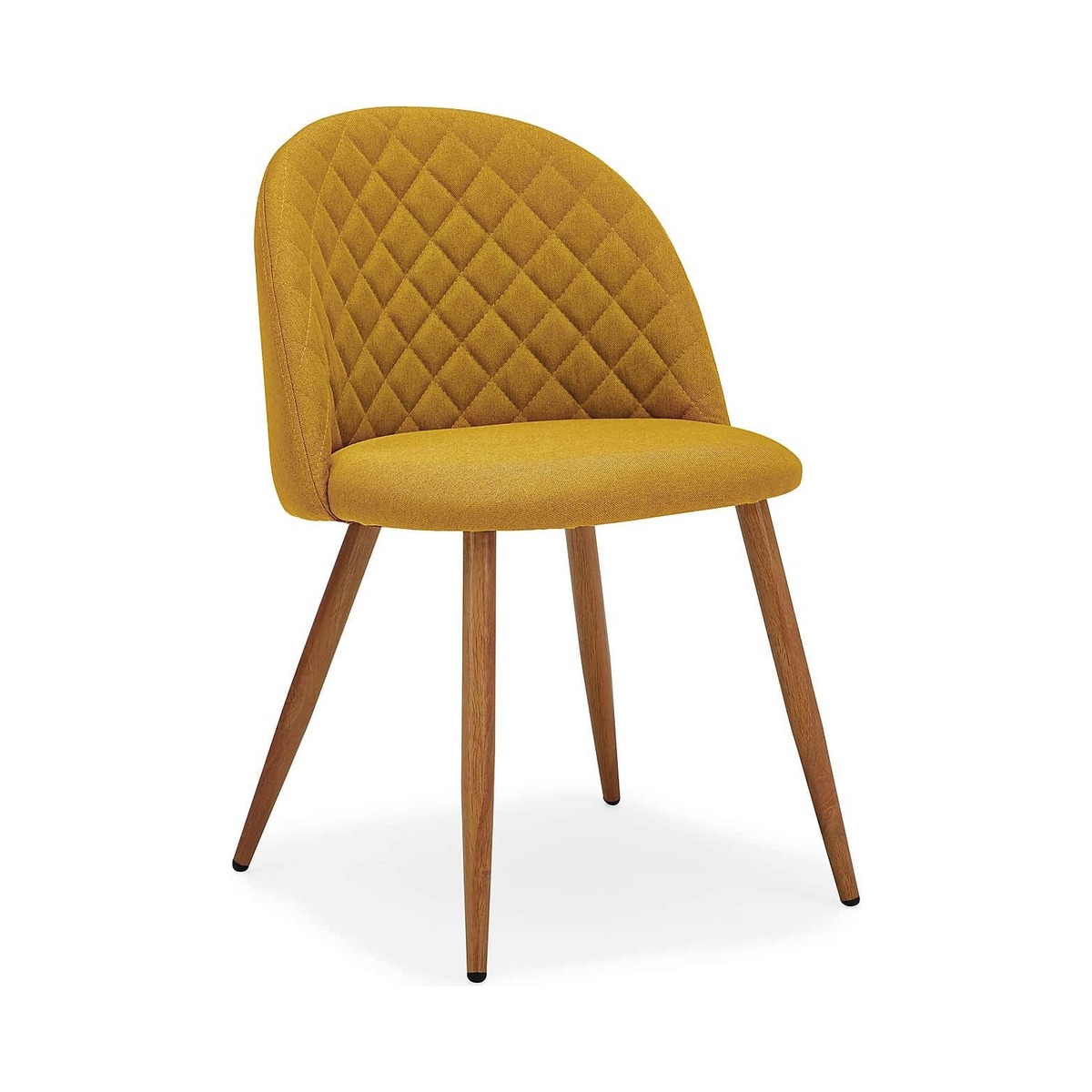 I love this chair’s cheerful yellow fabric; it’s a great way to introduce colour and warmth to a dining space. Its curved silhouette and quilted backrest add a touch of modern elegance, making it versatile enough for both contemporary and mid-century inspired interiors. Ideal for kitchens or dining rooms with neutral or muted palettes, the yellow can act as a statement piece or complement other colourful accents. Practical styling tips include pairing it with a wooden or neutrally upholstered table to let the chair stand out, and adding soft textiles like a cosy throw or patterned cushions nearby to create a welcoming, layered look. It’s also resilient enough to work well in lively households, thanks to its durable upholstery.