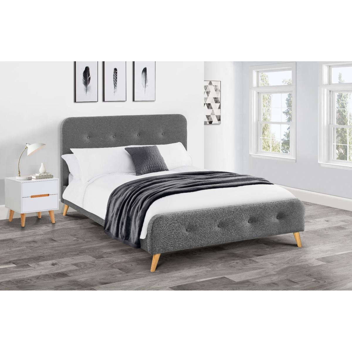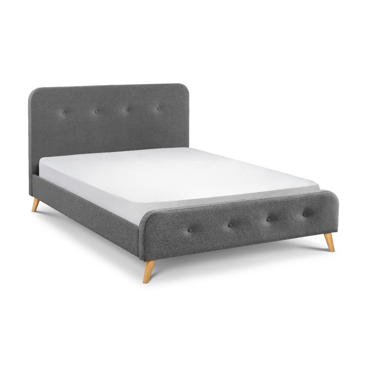 The Astrid Curved Retro Buttoned Bed is a statement way of bringing classic Scandinavian style to your bedroom. Immediately engaging and effortlessly stylish, the bed offers up a cool grey linen-style fabric upholstery, complete with neat buttons and smart light oak splayed legs for a touch of fun. In king size it’s perfect for guest quarters as well as your master bedroom too. Elegant combination of modern upholstery and simple oak legs. Sprung slatted base ensures comfort every night Neat buttoned finish to the headboard and foot. Elegantly coordinates with many modern interiors