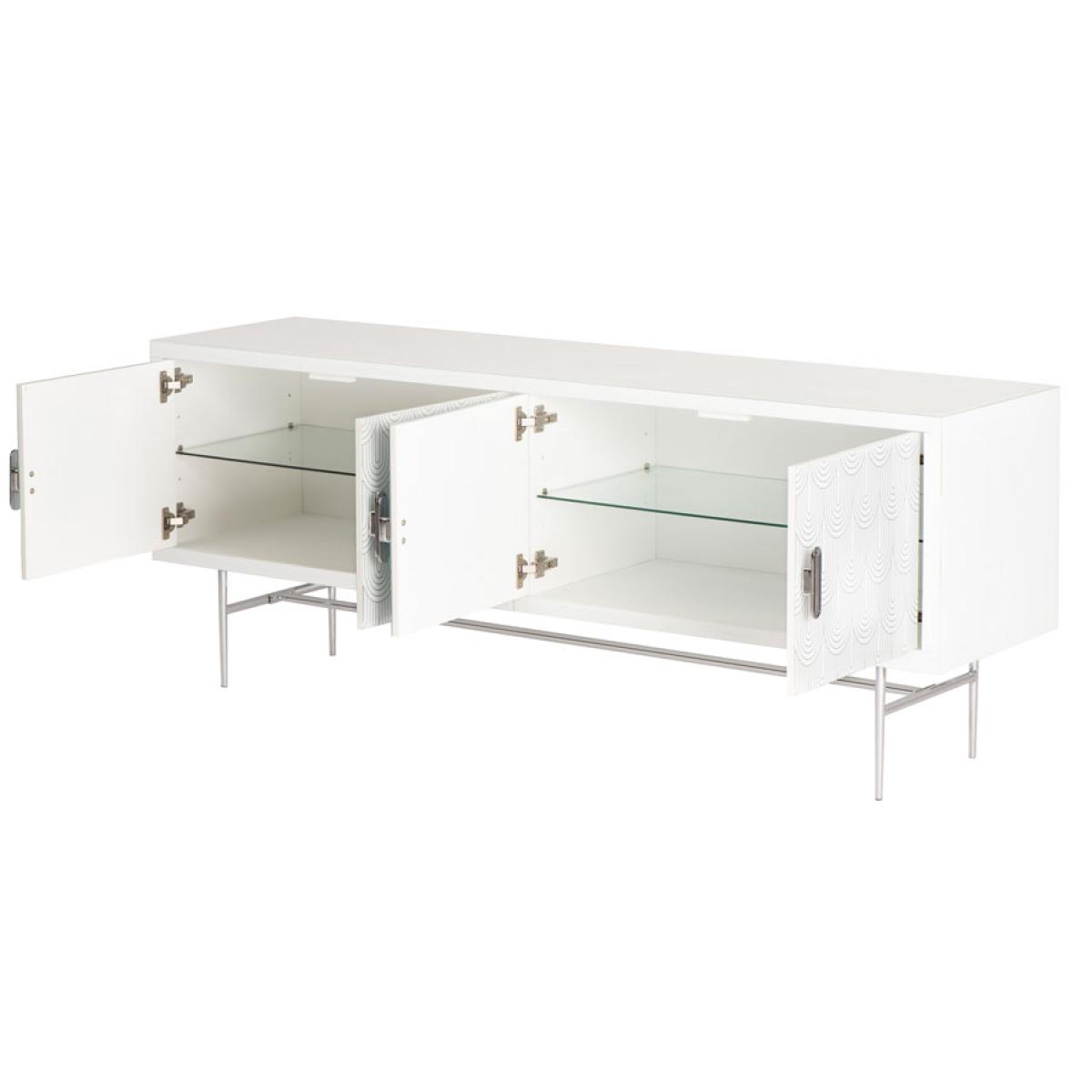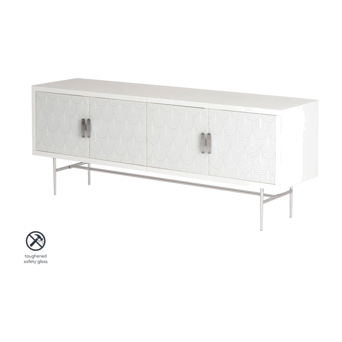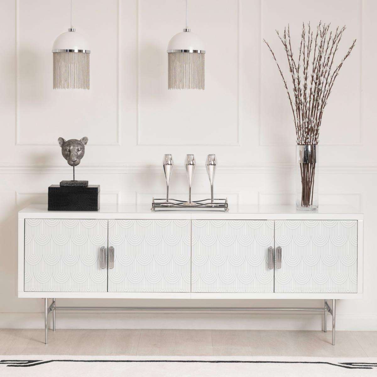 An elegant and feminine sideboard. Strong and durable toughened white glass with bevelled edges and a delicate art deco inspired screen print. Distinctive handles with a polished chrome finish. White painted interior. Tapered polished chrome leg detailing. Cable ports and adjustable shelves make this ideal for use as a television or media unit. Part assembly required.