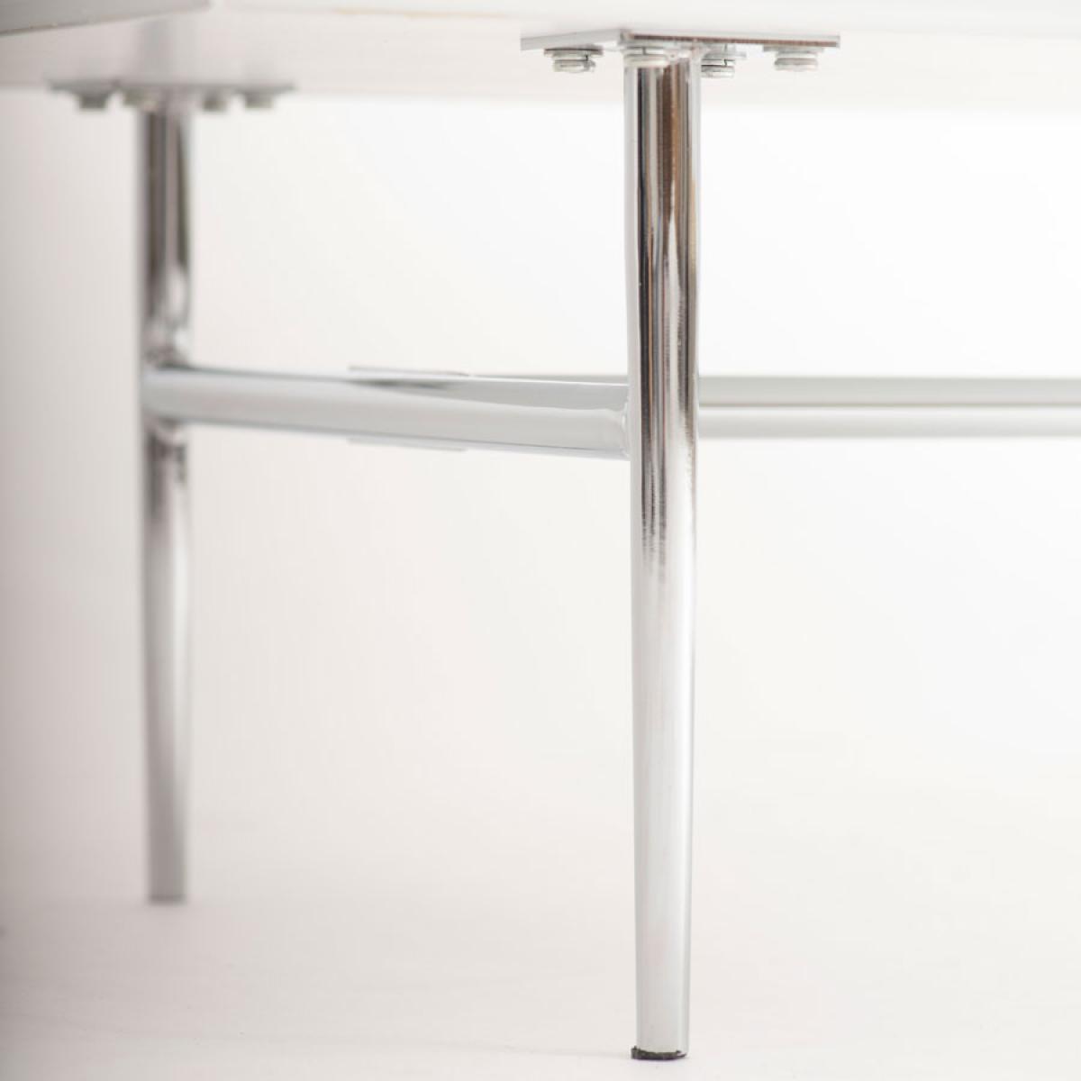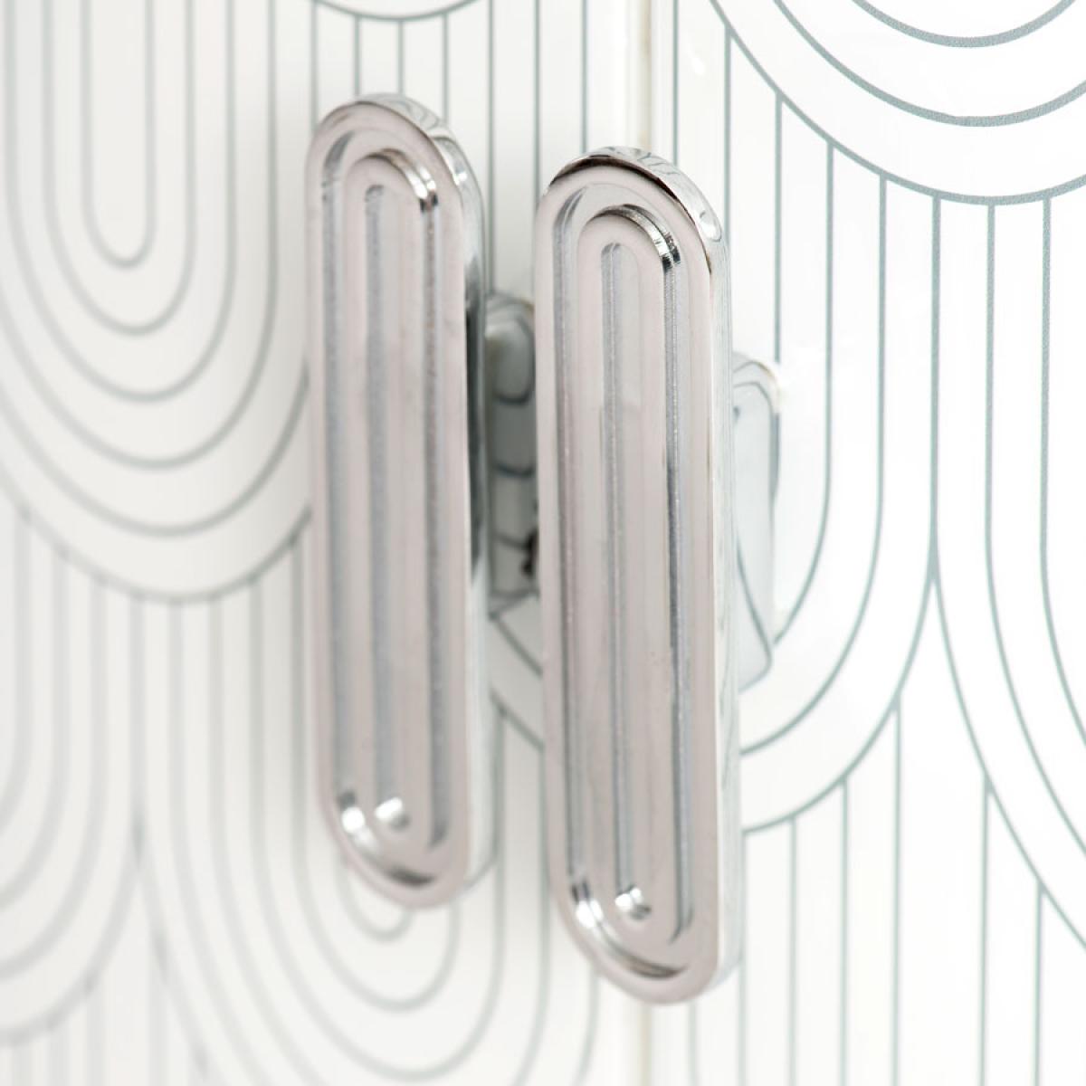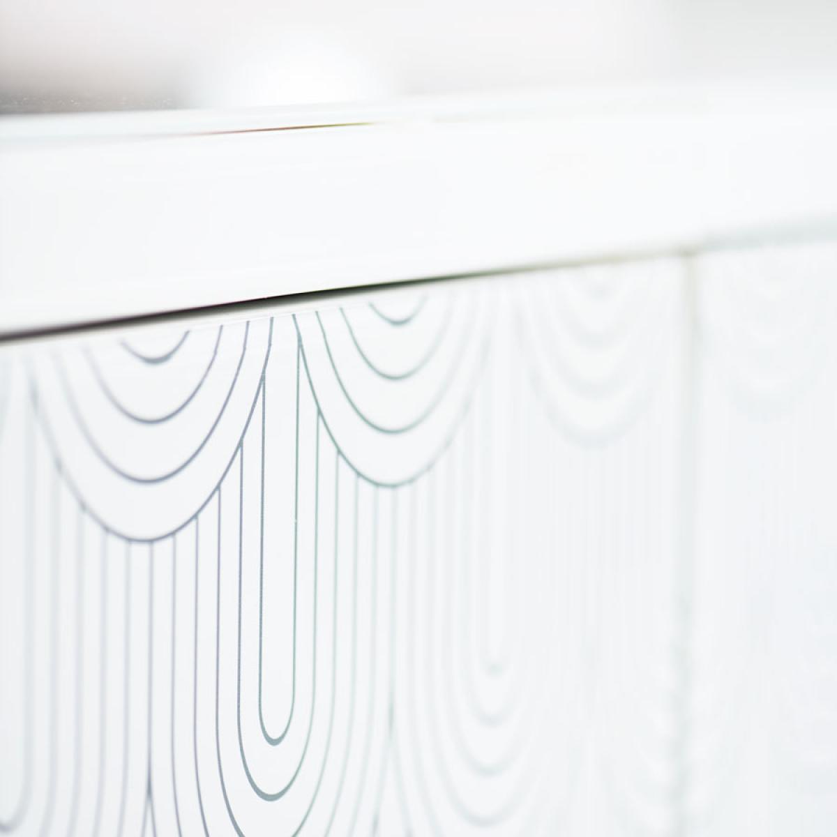 An elegant and feminine sideboard. Strong and durable toughened white glass with bevelled edges and a delicate art deco inspired screen print. Distinctive handles with a polished chrome finish. White painted interior. Tapered polished chrome leg detailing. Cable ports and adjustable shelves make this ideal for use as a television or media unit. Part assembly required.