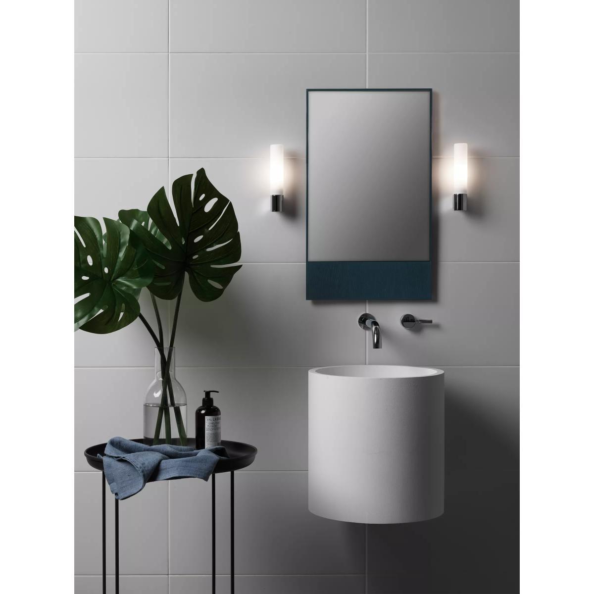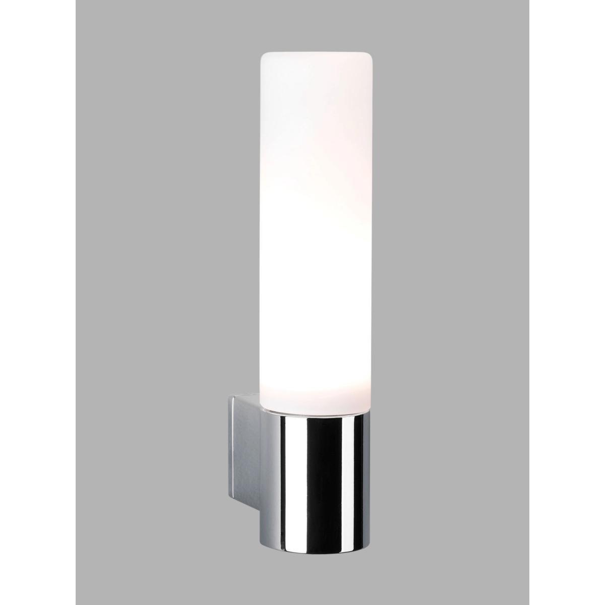 A simple, unfussy bathroom wall light, with an opal glass tube mounted on a polished chrome fitting. IP44.