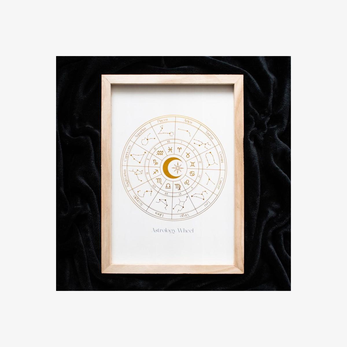 Beautiful wood framed print of the Astrology Wheel in a golden foil finish. A stunning piece for styling the home. With its neutral colourway and eyecatching metallic finish, it's sure to become a conversation piece for house guests and visitors wanting to lookup their star sign.