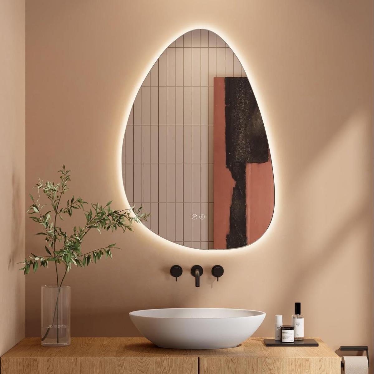 I love this mirror for its modern, asymmetrical shape and practical features. The dimmable LED lighting creates a clean, bright glow that’s perfect for grooming tasks, while the anti-fog element ensures a clear reflection at all times-ideal for any busy bathroom. It works well in contemporary or minimalist interiors, especially where a statement mirror can add visual interest without overwhelming the space. For styling, consider pairing it with sleek, matte finishes and muted tones to highlight its unique shape. Placing it above a simple vanity with minimal accessories allows the mirror itself to be the focal point, making it a smart choice for a functional yet stylish bathroom setup.