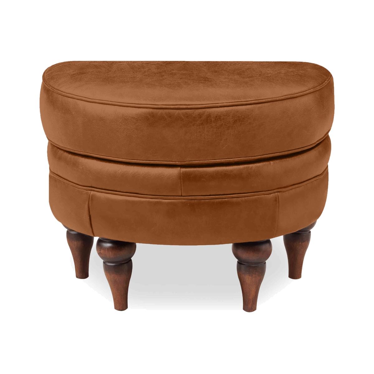 Perfect paired with our At The Helm Harriet leather wing chair, this stylish and versatile half-moon footstool is beautifully cushioned and has turned wood legs. Only at Furniture Village. Why you'll love it Traditional elegance, luxurious comfort. Handmade by At The Helm, master crafter of sumptuous furniture for modern living. Contemporary half-moon shaped footstool is stylish and versatile. Features an array of authentically crafted details. Solid wood frame is cut and assembled by hand. Turned legs made of solid wood have an antique walnut finish. Hand-cut and hand-sewn 100% leather upholstery in a choice of colours. Exclusive to Furniture Village. Guaranteed for life. This leather footstool is part of our At The Helm Harriet collection. What you need to know Cushioning: foam. Some fabrics can show wear on areas of more use or in direct sunlight. Leather has unique marks and characteristics with variation in colour and texture. Leather softens with use. Smoothing the tops of leather cushions prevents signs of visual comfort. Please read our upholstery care guide for more advice.