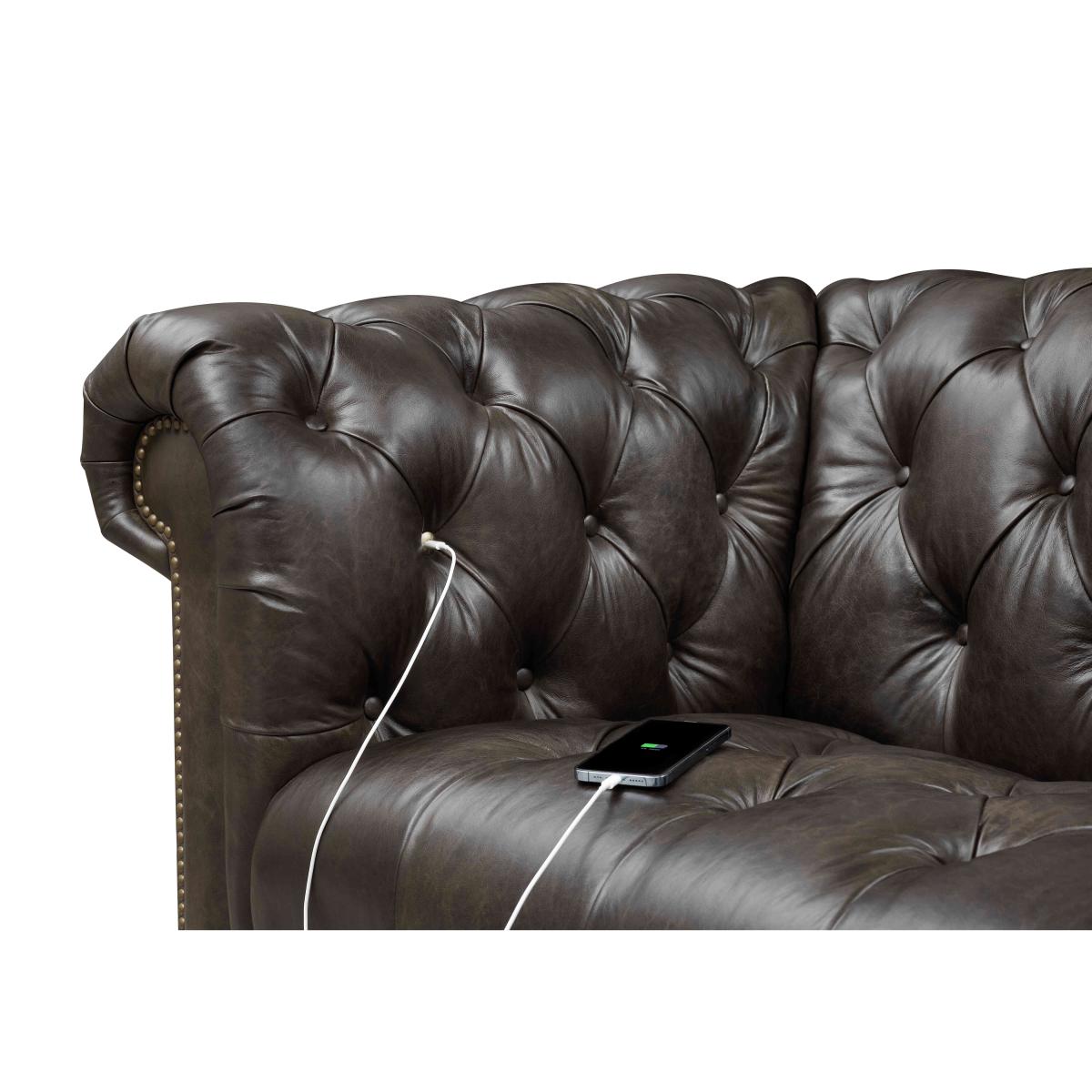 Classic Chesterfield style and high-tech comfort come together in our Walter collection, designed for all-day lounging. You’ll appreciate the wealth of authentic details, from the deep buttoning and metallic studding to those sweeping scroll arms and traditional castors. And you can expect just as many comfort features – from sprung seats to luxurious cushioning to optional fast USB-C charging. Simply curl up against its well-padded arms to watch a movie and you’ll understand why a Walter sofa or chair is a living room must-have. The Walter range includes a wide choice of Chesterfield sofas and armchairs in both 100% leather and soft fabric. Handmade exclusively for Furniture Village by At The Helm.You’ll be happy to settle down on this stylish leather Chesterfield chair for an hour or three. With a sprung seat, superb cushioning and USB-C port, it’s made for lounging. Handmade. Why you'll love it This inviting leather Chesterfield chair with USB-C will keep you comfy for hours. A new original designed for all-day lounging. Super-fast USB-C charging means you can relax for longer. Curl up against the sumptuous scrolled and pleated arms. So many Chesterfield details including buttoning, studding and castors. Beautiful 100% leather upholstery in a choice of on-trend colours. Superb craftsmanship – double hand-tied buttoning and hand-applied studding. Exclusive to Furniture Village. Handmade by At The Helm, master crafter of sumptuous sofas for modern living. This leather Chesterfield chair with USB-C is part of our At The Helm Walter collection. What you need to know Medium comfort level. Suspension: no-sag serpentine springs. Cushioning: high- and medium-density foam encased in a Dacron wrap. Castors and studding in brass or pewter finish, depending on your upholstery choice. Leather has unique marks and characteristics with variation in colour and texture. Leather softens with use. Smoothing the tops of leather cushions prevents signs of visual comfort. Please read our upholstery care guide for more advice. Please ensure that our delivery team has sufficient access to your home.