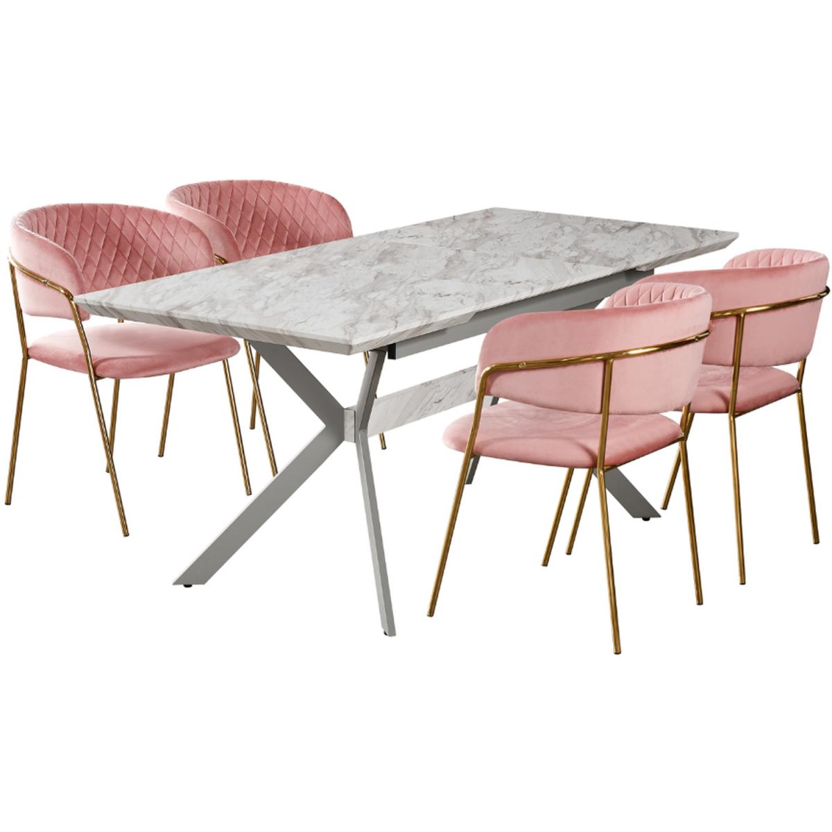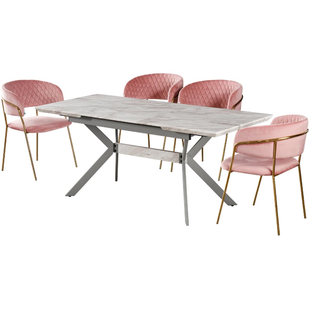 We are introducing the Atarah Blaze dining set of 4 that includes a Blaze Rectangle Dining Table, which features an evergreen aesthetic and functionality of iconic mid-century modern furniture. Simply pull the table ends apart and an extra leaf pops into place allowing you to seat six with ease. The base is the sculptural cross-shaped design of legs in powder-coated MDF. The chic and innovative table to pass the test of time and help you live better. Comes with the Atarah LUX Velvet dining chairs, expertly designed, featuring a gold frame paired with the high-quality velvet with quilted embroidery accentuating the luxury feel and is sure to make a statement in your space. The Atarah chairs have been built from the ground up, with style, class, and high-quality craftsmanship in mind. To ensure this wonderful Velvet finish dining chair meets expectations, we have had to go into high levels of detail to secure this retro look with a modern twist. The dining set is ideal for the dining room, kitchen restaurant, and many more.