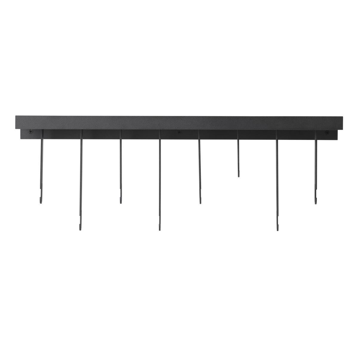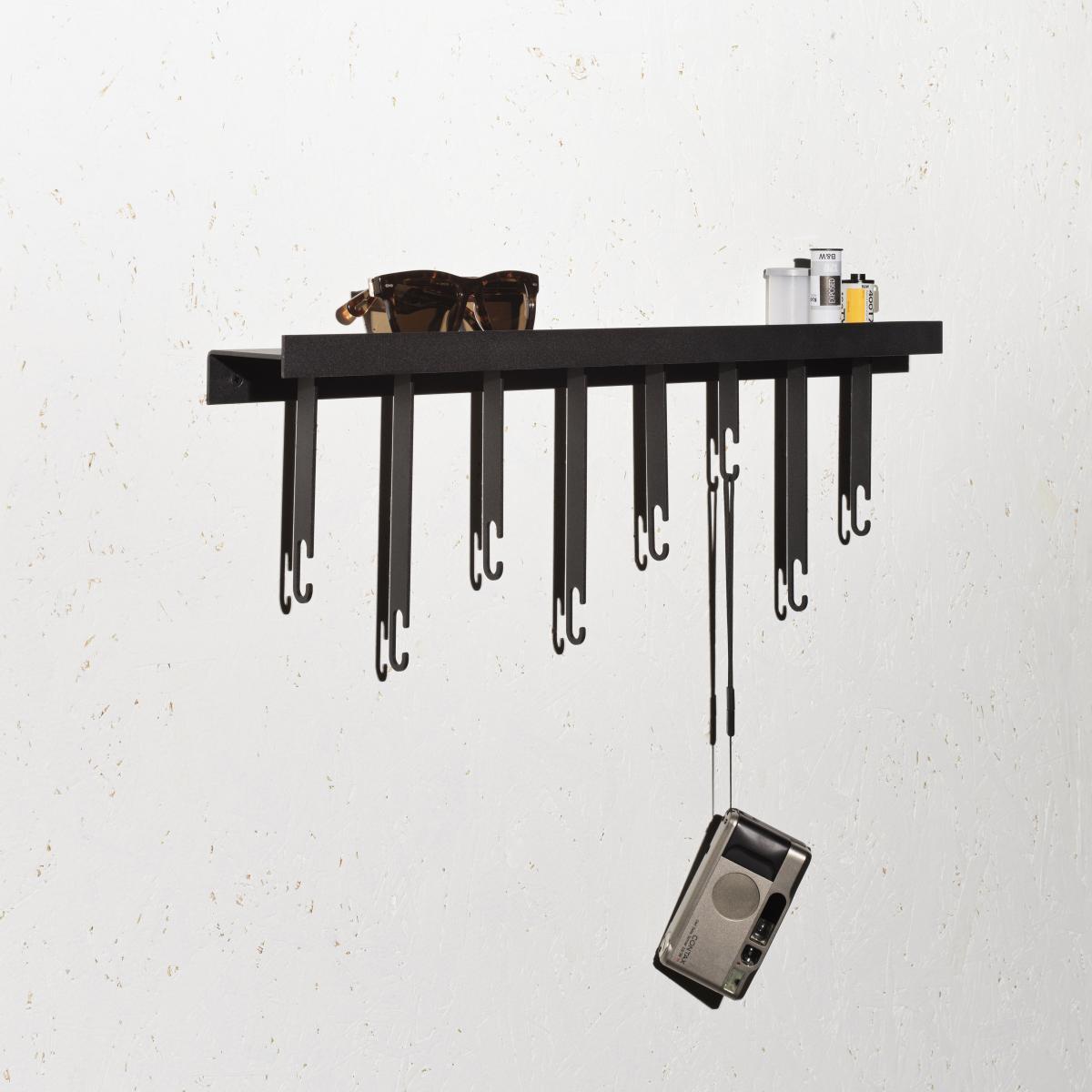 An industrial, very graphic feel for this large wall-mounted steel coat rack. It is equipped with 8 hooks arranged at different heights. The Atelier coat rack means you can hang lots of clothes in a minimal space. This architectural structure provides a refined setting for your coats, clothes, scarves or even your towels in the bathroom. It has the added benefit of airing your clothes. The shelf with its rim provides somewhere to put your mobile phone, keys, a nice framed poster or your beauty products.