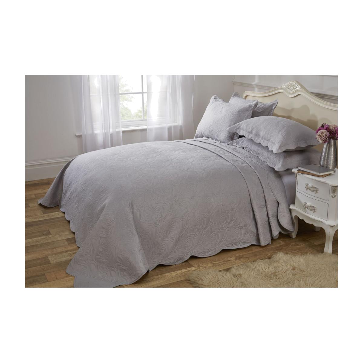 Athena Bedspread Set Silver. This quilted soft and cosy bedspread has a classic and subtly embroidered paisley design making it a versatile choice for any dcor. Comes complete with pillow shams -1 in single bed, 2 in double and king.