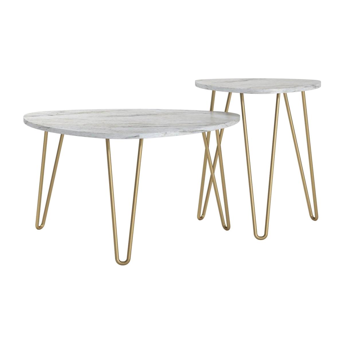 Add an instant upgrade to your living room with the space-saving design of the Novogratz Athena Nesting Tables. The faux white marble finish on the PVC laminated particleboard pairs with the gold metal hairpin legs for a mix of retro and glam styles.