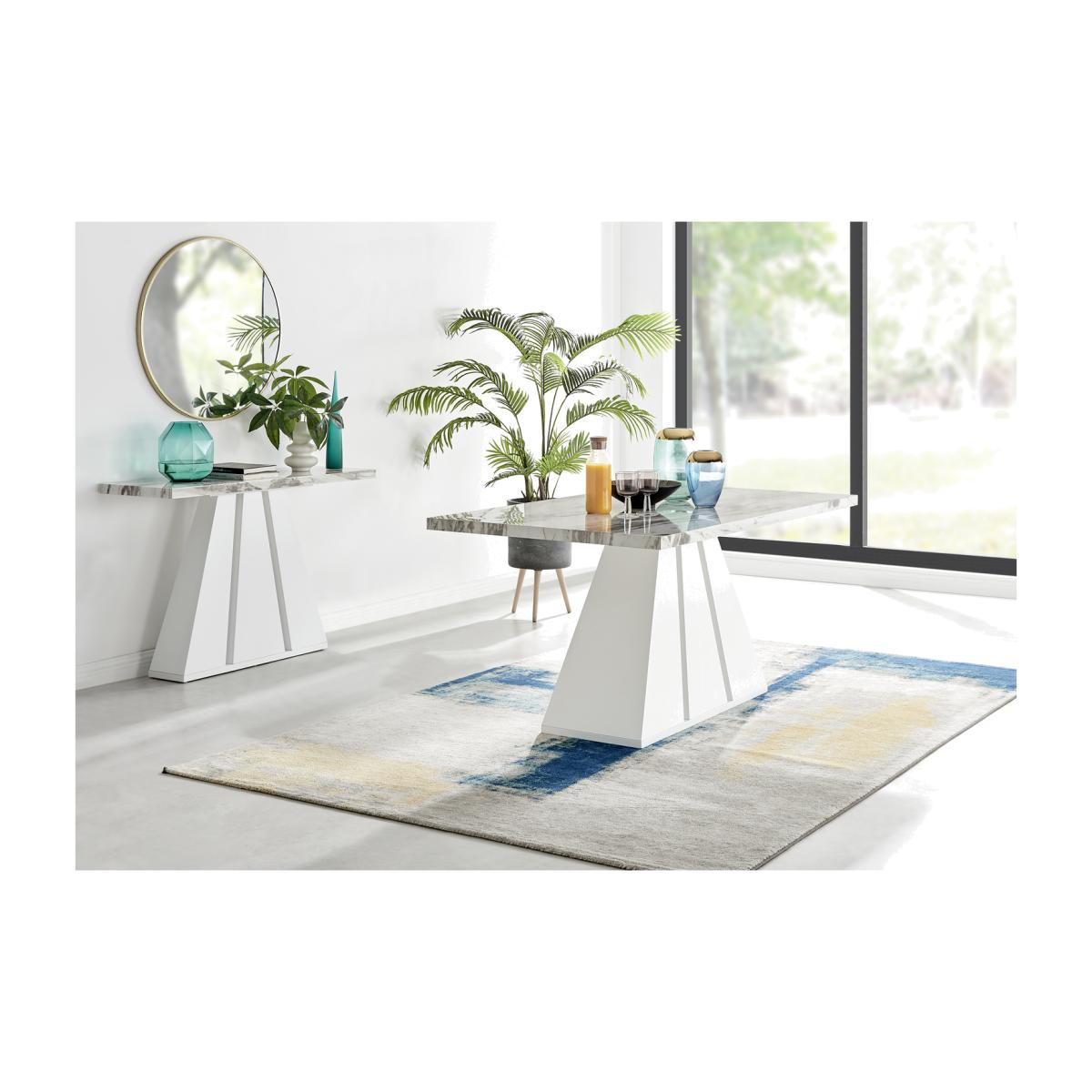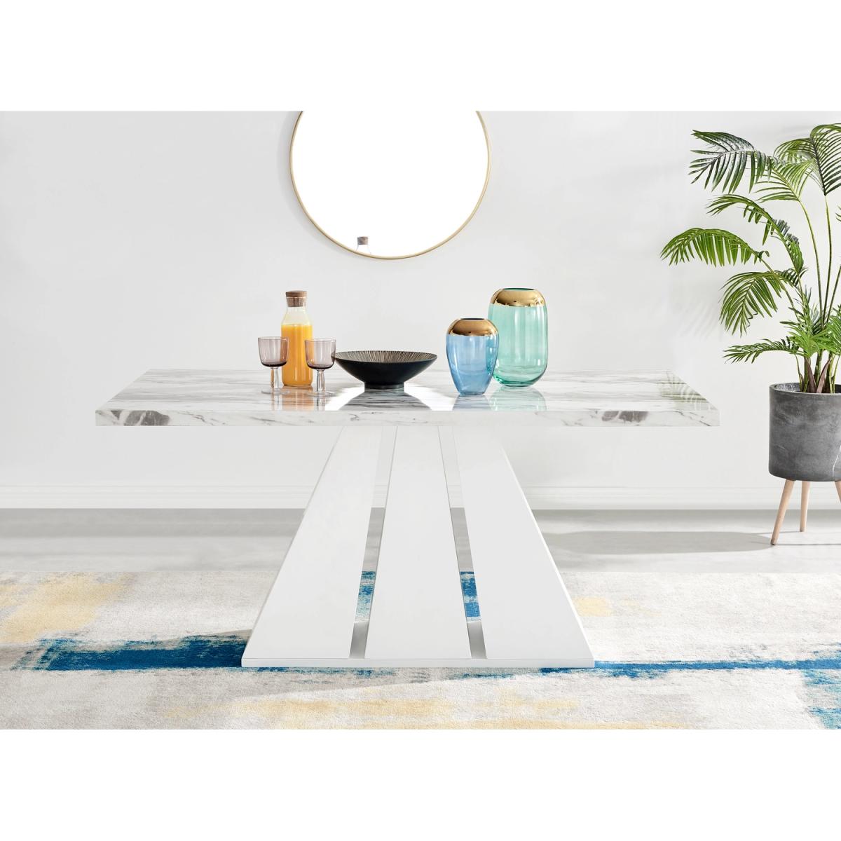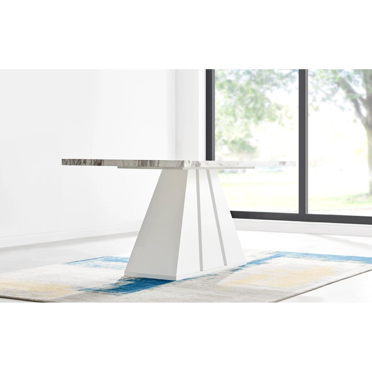 Featuring a stunning white matte pedestal base and a large rectangular top, the Athens modern dining table will be a stunning choice for your next dining set. The Athens is a 6 seat dining set so theres plenty of space to seat the whole family at dinner time. The three sections of the table base fan out for an art deco style pillar. This unique design elevates this from a dining table to a sculptural piece which will make a big impact in your dining room. Constructed from wood composite with a luxury matte finish which makes this table easy to keep clean. Its durable and will stay gorgeous for years to come. The table top here is a white marble effect which is smooth to touch gloss but has a gently textured appearance thanks to the natural looking marbling. The grey and white marble top compliments the solid white gloss base and makes the legs really stand out. Also available in other colours.