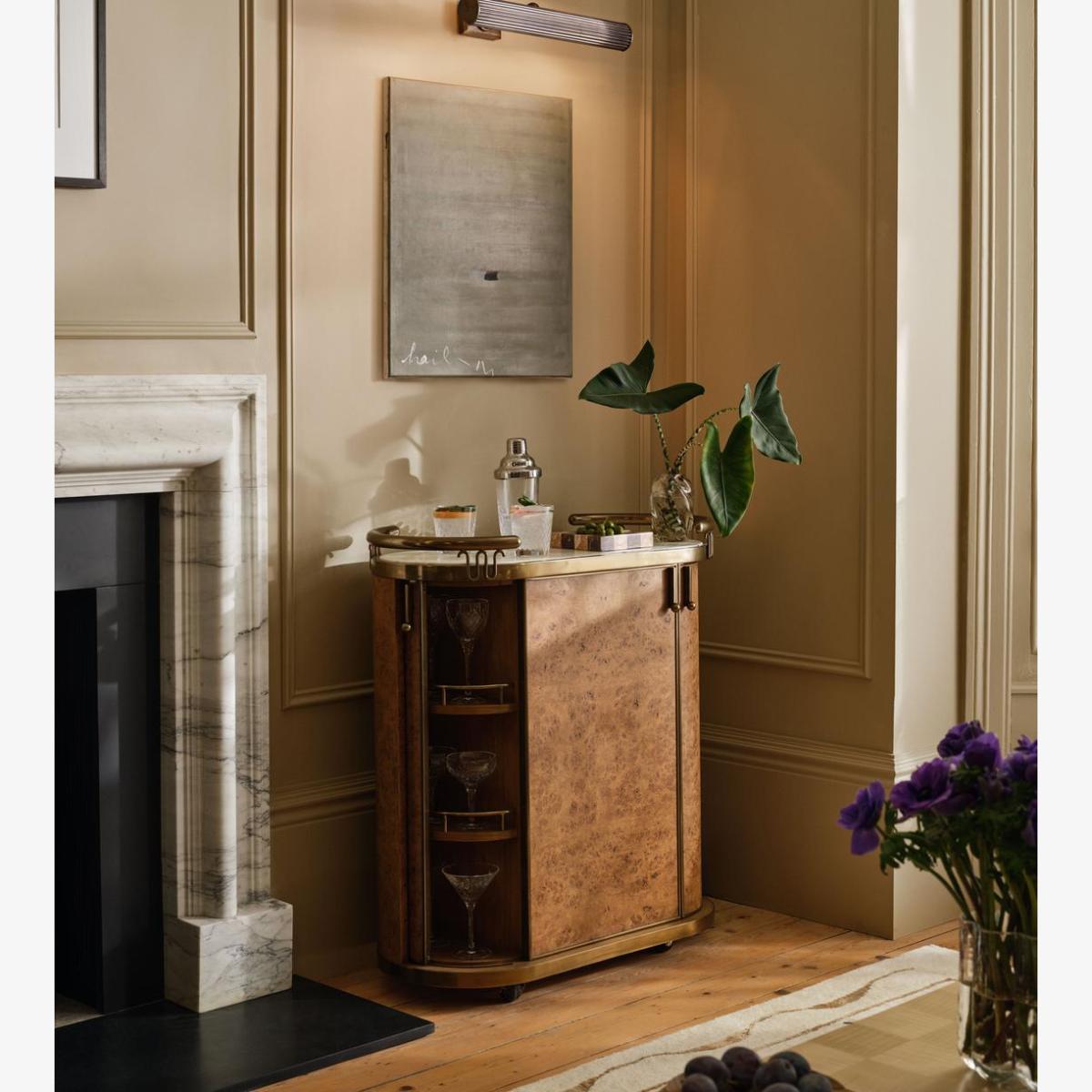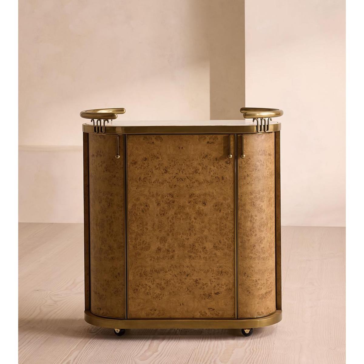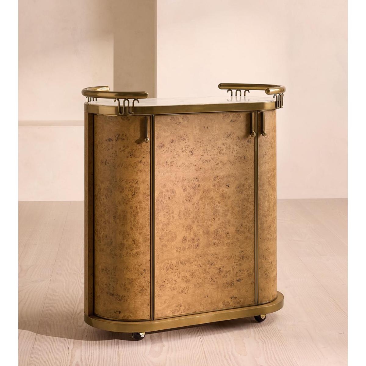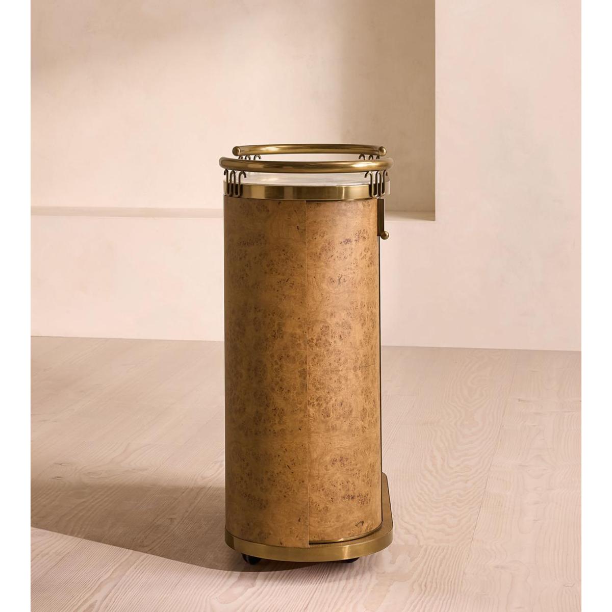 A pill-shaped oak burl silhouette is perched on wheels for ease of movement. Made from oak burl veneer, the portable Athos bar cart has a Calacatta Aura marble inset top made for serving guests or displaying drinks. Sliding doors on either side open up to shelved storage, while a central, hinged door reveals two adjustable shelves and additional space to store your glassware.