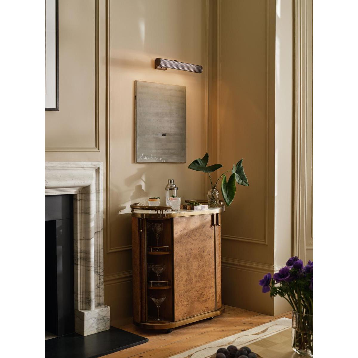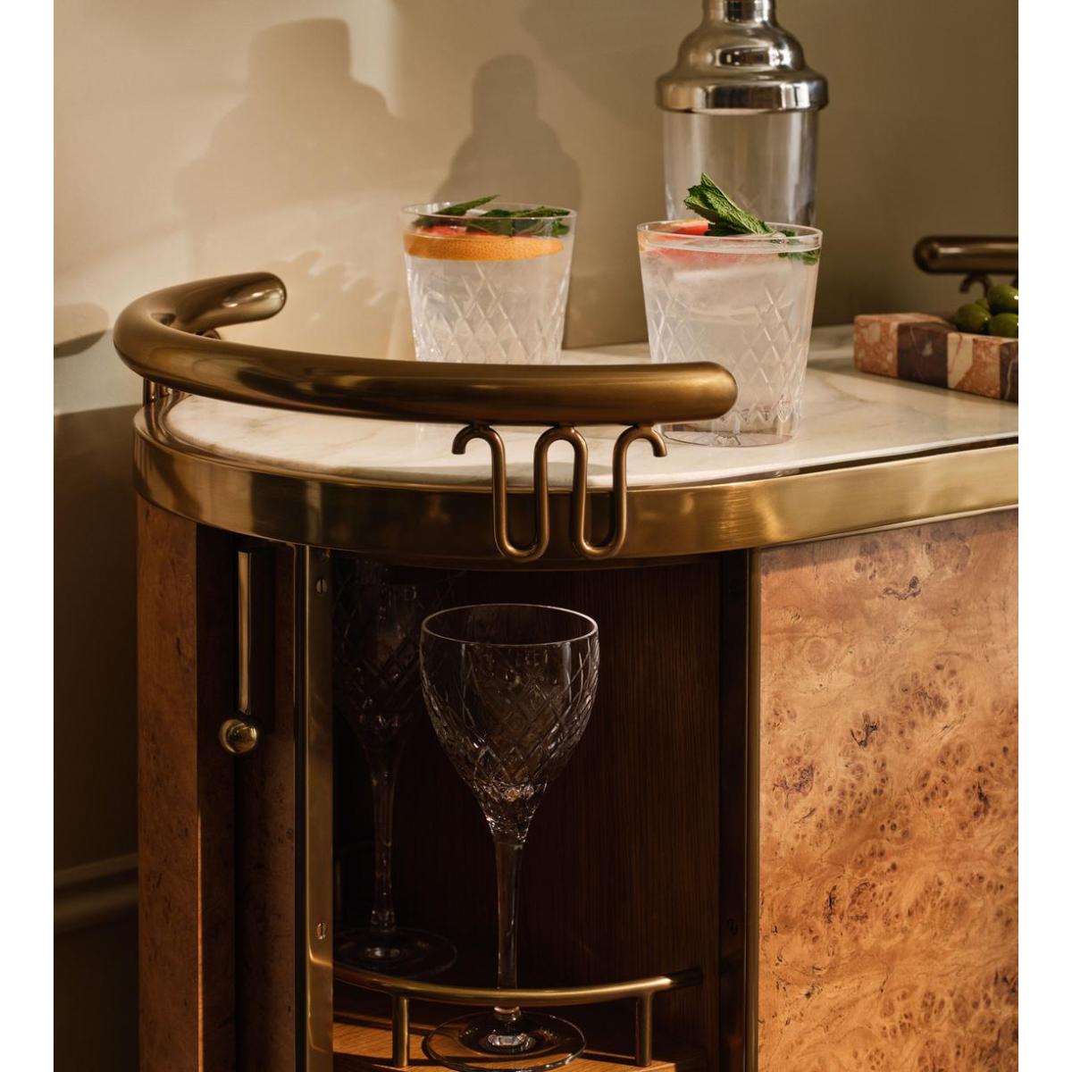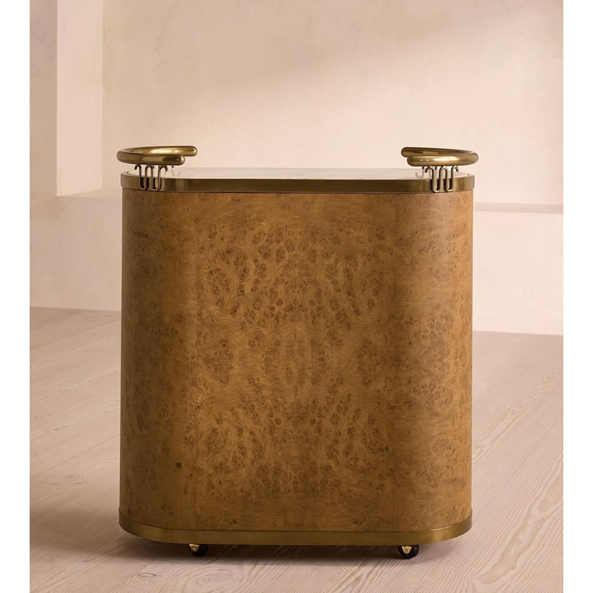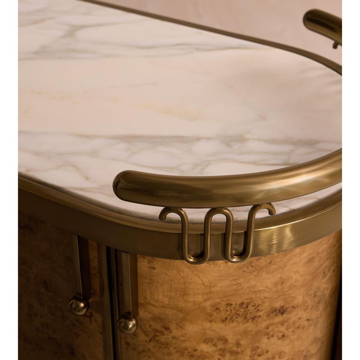 A pill-shaped oak burl silhouette is perched on wheels for ease of movement. Made from oak burl veneer, the portable Athos bar cart has a Calacatta Aura marble inset top made for serving guests or displaying drinks. Sliding doors on either side open up to shelved storage, while a central, hinged door reveals two adjustable shelves and additional space to store your glassware.