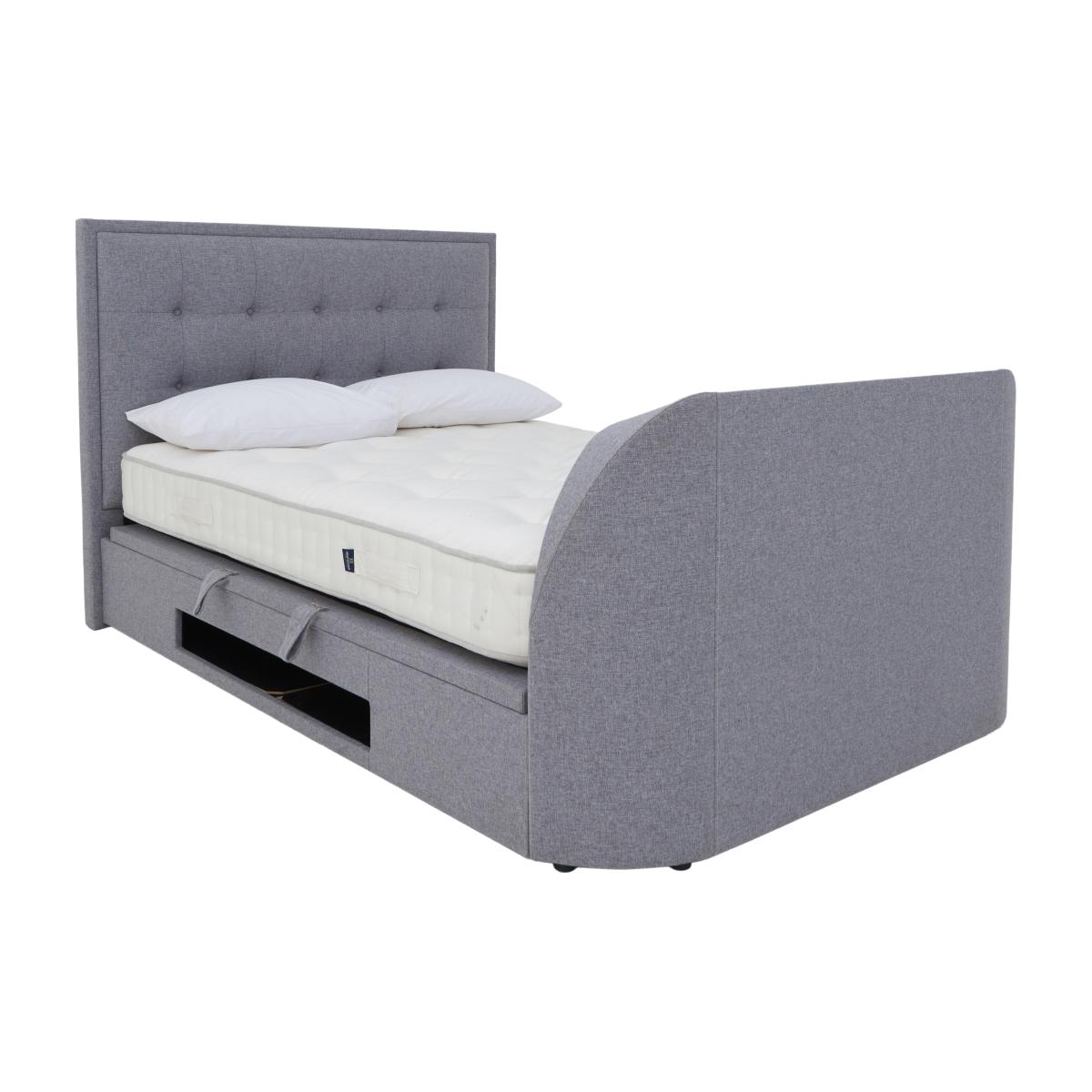 If you’re looking for the ultimate way to relax, here’s your bed frame. The Athos TV ottoman bed frame looks fabulous, has a huge underbed storage space and can hide a 43 inch TV in its foot end. Why you'll love it This beautifully buttoned TV ottoman bed frame is the ultimate in relaxation. Contemporary style, high-tech functionality. Slim foot end can accommodate up to a 43 inch TV (not included). TV is raised and lowered by remote control (supplied). Spacious side-opening ottoman storage with hydraulic lift mechanism. Cushioned headboard with understated buttoning. Upholstery is finished by hand. Frame is handmade. The small side storage and side ottoman opening can be on either side of the bed. In double, king and super king sizes. Exclusively available at Furniture Village. This TV ottoman bed frame is part of the Athos range. What you need to know Mattress sold separately. TV not included. Please take care when opening and closing the ottoman. Clean regularly using a soft brush or vacuum with the curtain attachment. Deal with any spills promptly. Professional cleaning advised for oil- and grease-based stains. Some fabrics can show wear on areas of more use or in direct sunlight.