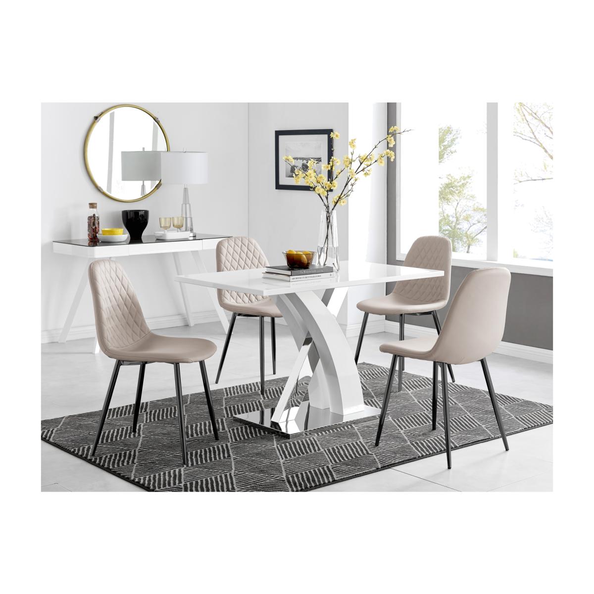 Strikingly elegant, the Atlanta dining set will light up any room! Coupling slick white high gloss and a beautifully crafted chrome metal base and diagonal support, the table really does make a statement. Generously offering a 120cm x 70cm top, made from wood with a smooth high gloss coating, the table allows plenty of room for dining with guests. Easy wipeclean surfaces also allow this table to look brand new for years to come! Styled with our statement Corona dining chairs, this set is a perfect balance of pattern and texture. The sleek black powder coated legs of the Corona chairs are a great way to add a touch of minimalist style to your home. The Scandi-style faux leather seat with diamond pattern stitching is a unique take on a classic design offering comfort and durability for everyday use.