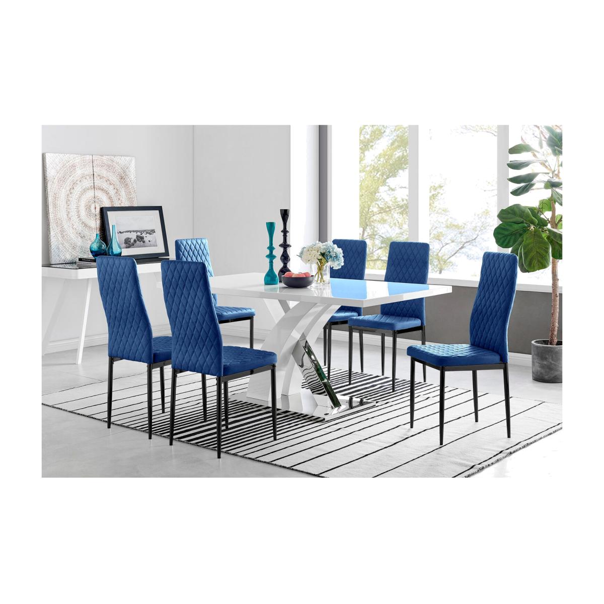 Strikingly elegant, the Atlanta dining table will light up any room! Coupling slick white high gloss and a beautifully crafted chrome metal base and diagonal support, this table really does make a statement. Generously offering a large 160cmx90cm top, made from wood with a smooth high gloss coating, the table allows plenty of room for dining with guests. Easy wipeclean surfaces also allow this table to look brand new for years to come! So why not add a classy and sophisticated touch to your dining room with this stunning Atlanta table, you won't regret it! Upholstered in soft touch navy blue velvet and finished with diamond pattern stitching the Milan dining chairs would seamlessly fit in with most dining spaces, whilst not compromising on either style or comfort. The stylish black powder coated metal leg and hatched velvet combination gives this chair a contemporary edge, whilst it's simple design allows for practical everyday usage. The chairs are made from high quality durable velvet that's easy to keep clean and are ergonomically designed for maximum comfort and support. They feature a deep foam seat cushion and plastic feet to protect the floor from any damage! At an unbeatable price you cannot go wrong with these chairs!