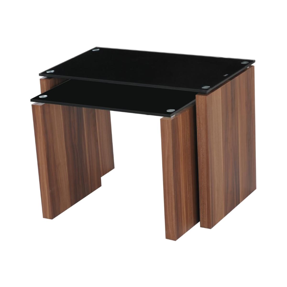 Atlanta nest of tables feauring 2 small tables with walnut paper finish and black glass tabletops. Introducing the Atlanta Nest of Tables, a sleek and versatile addition to your living space. Crafted with a walnut paper finish, these tables exude warmth and sophistication, while the black glass tops add a touch of contemporary elegance. Perfect for entertaining or simply serving as stylish accents, this nesting set effortlessly combines form and function. Whether used together for a cohesive look or separately to accommodate various needs, the Atlanta Nest of Tables offers versatility and chic design to enhance any modern home aesthetic. Atlanta nest of tables feauring 2 small tables with walnut paper finish and black glass tabletops. Introducing the Atlanta Nest of Tables, a sleek and versatile addition to your living space. Crafted with a walnut paper finish, these tables exude warmth and sophistication, while the black glass tops add a touch of contemporary elegance. Perfect for entertaining or simply serving as stylish accents, this nesting set effortlessly combines form and function. Whether used together for a cohesive look or separately to accommodate various needs, the Atlanta Nest of Tables offers versatility and chic design to enhance any modern home aesthetic.