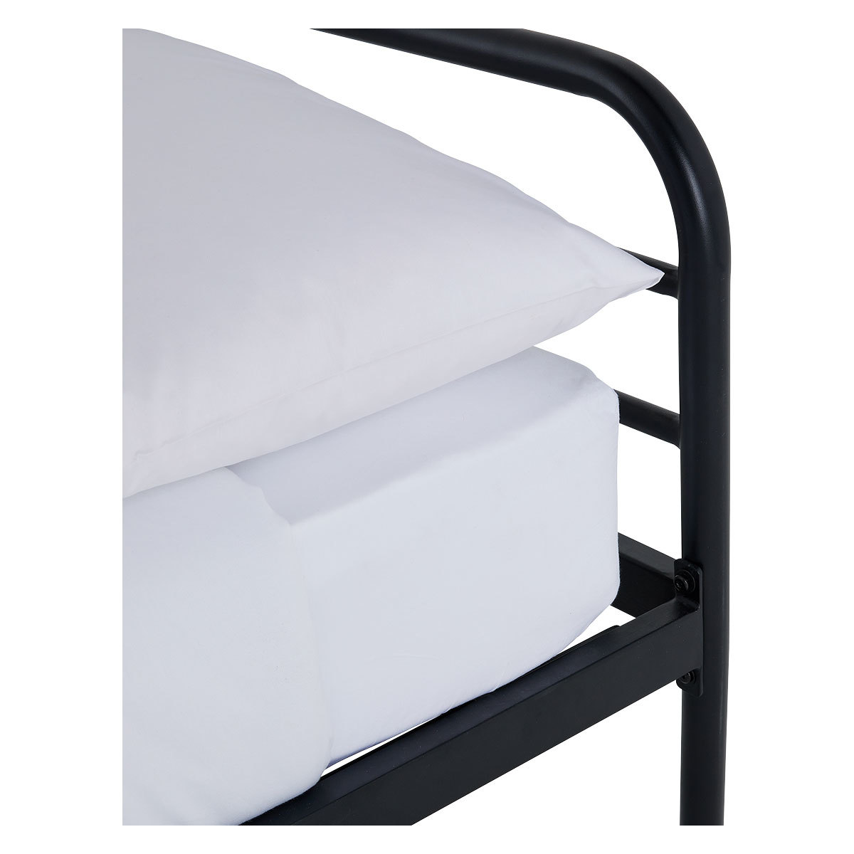 Low, curved head and footboards give the Atlanta black metal kingsize bed frame a striking silhouette that provides a neutral base for bed linen. The contemporary bed frame has a powder-coated finish and metal slats that provide a strong, stable base for a mattress. A standard UK 150cm kingsize mattress fits the Atlanta bed, which is available in 2 sizes and a choice of colours, shop our mattress collection to find one that suits the way you sleep.