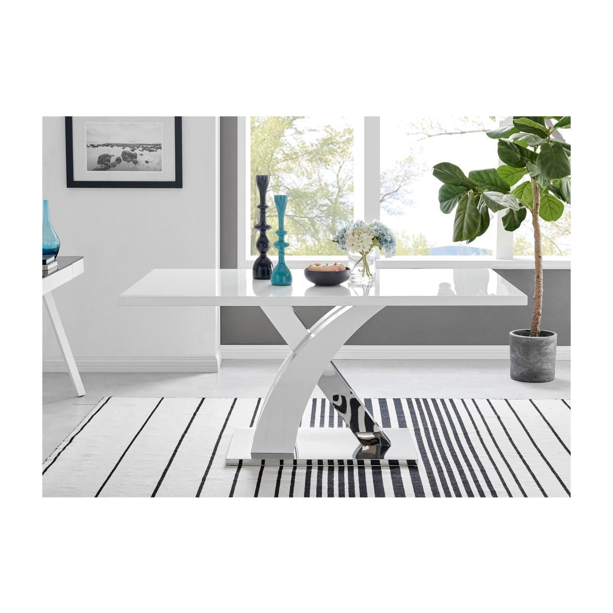 Strikingly elegant, the Atlanta dining table will light up any room! Coupling slick white high gloss and a beautifully crafted chrome metal base and diagonal support, this table really does make a statement. Generously offering a large 160cmx90cm top, made from wood with a smooth high gloss coating, the table allows plenty of room for dining with guests. Easy wipe-clean surfaces also allow this table to look brand new for years to come.