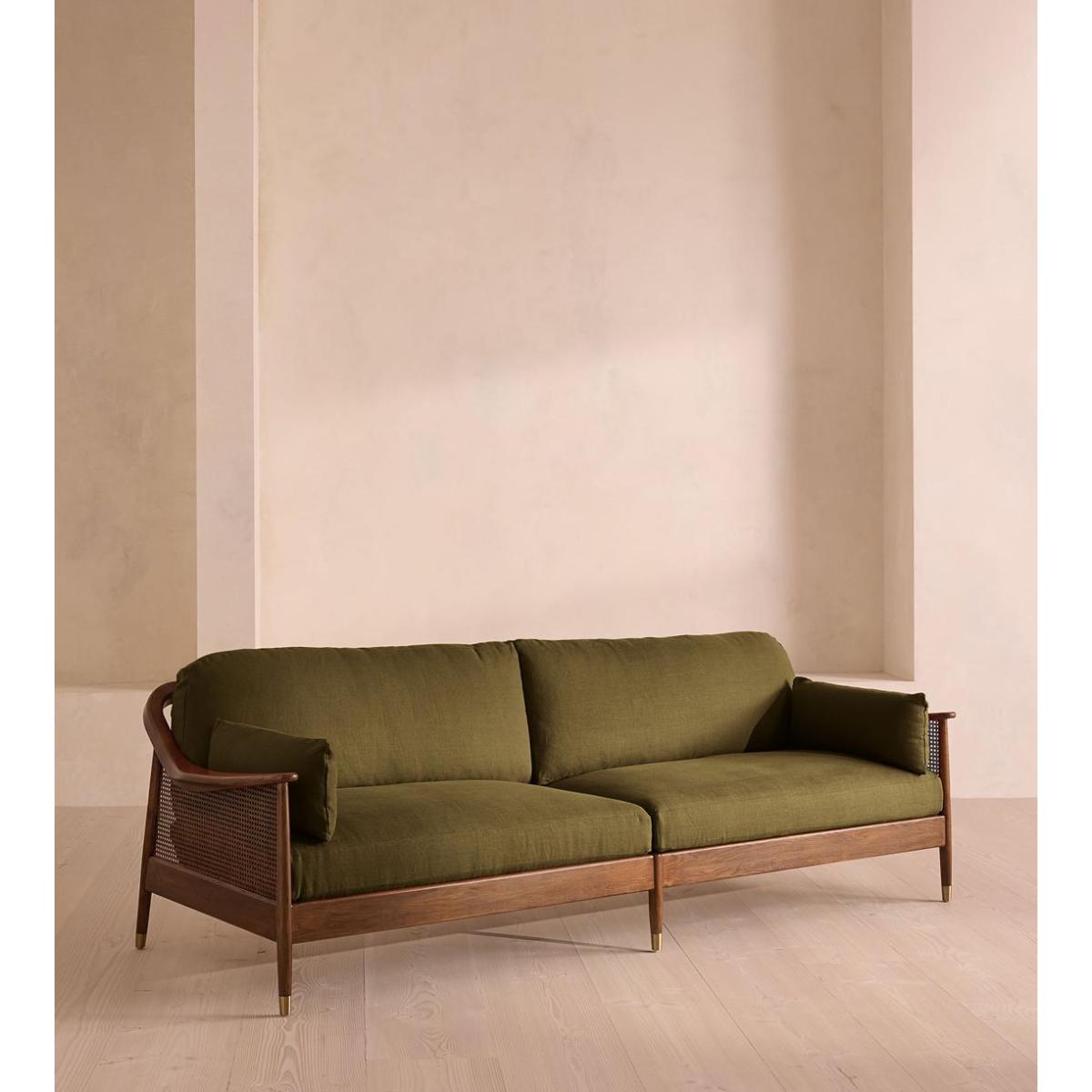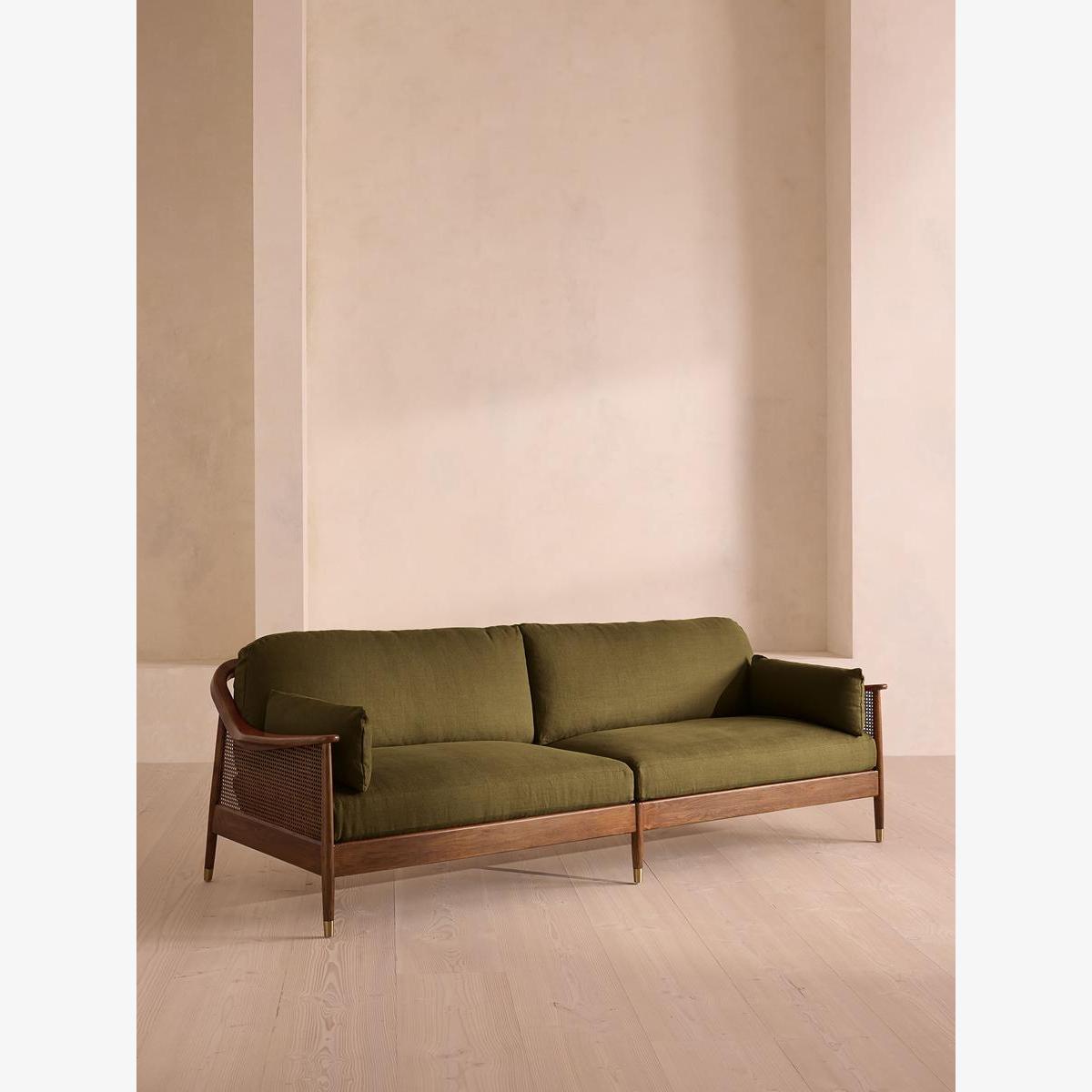Encased by rattan panelling on either side, a solid oak frame fitted with linen cushions is designed to seat up to four. The Atlanta four-seater sofa takes its inspiration from the design details seen throughout London's Shoreditch House. A solid oak frame finished with capped, antiqued brass feet and rattan panelling on either side is fitted with cushions wrapped in linen. Its upholstery is available in a range of bespoke shades.