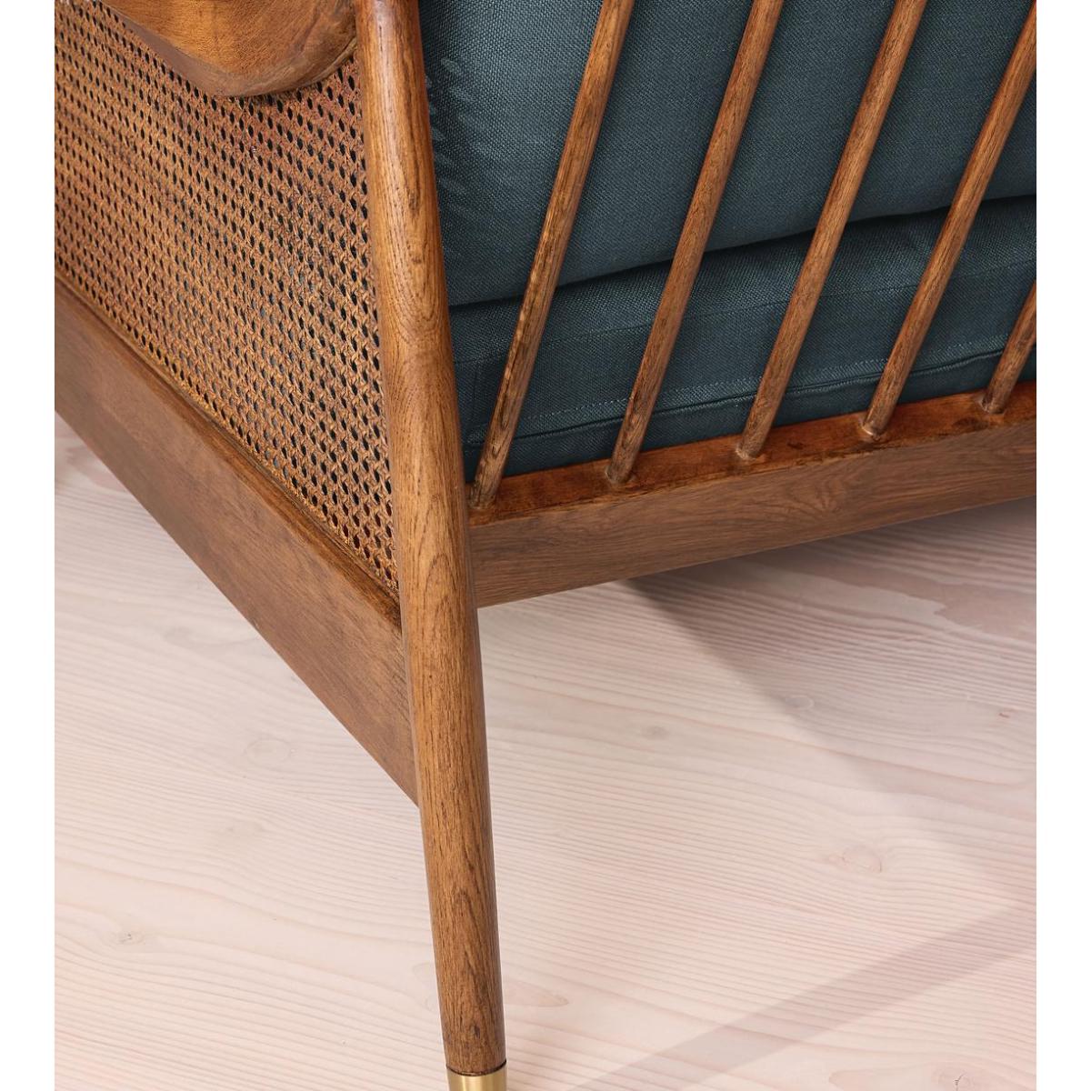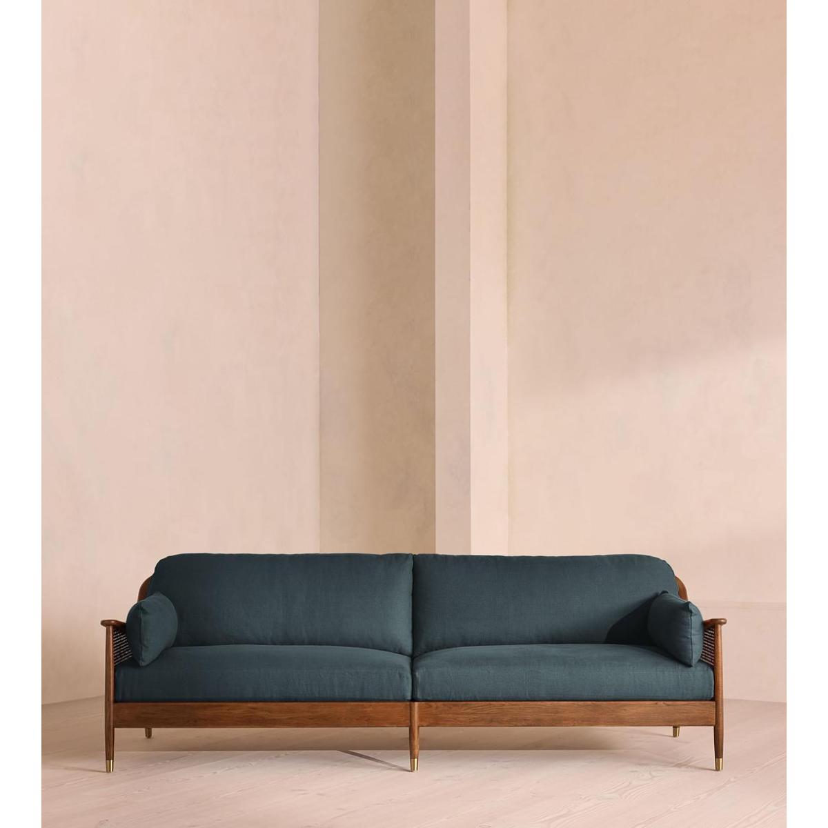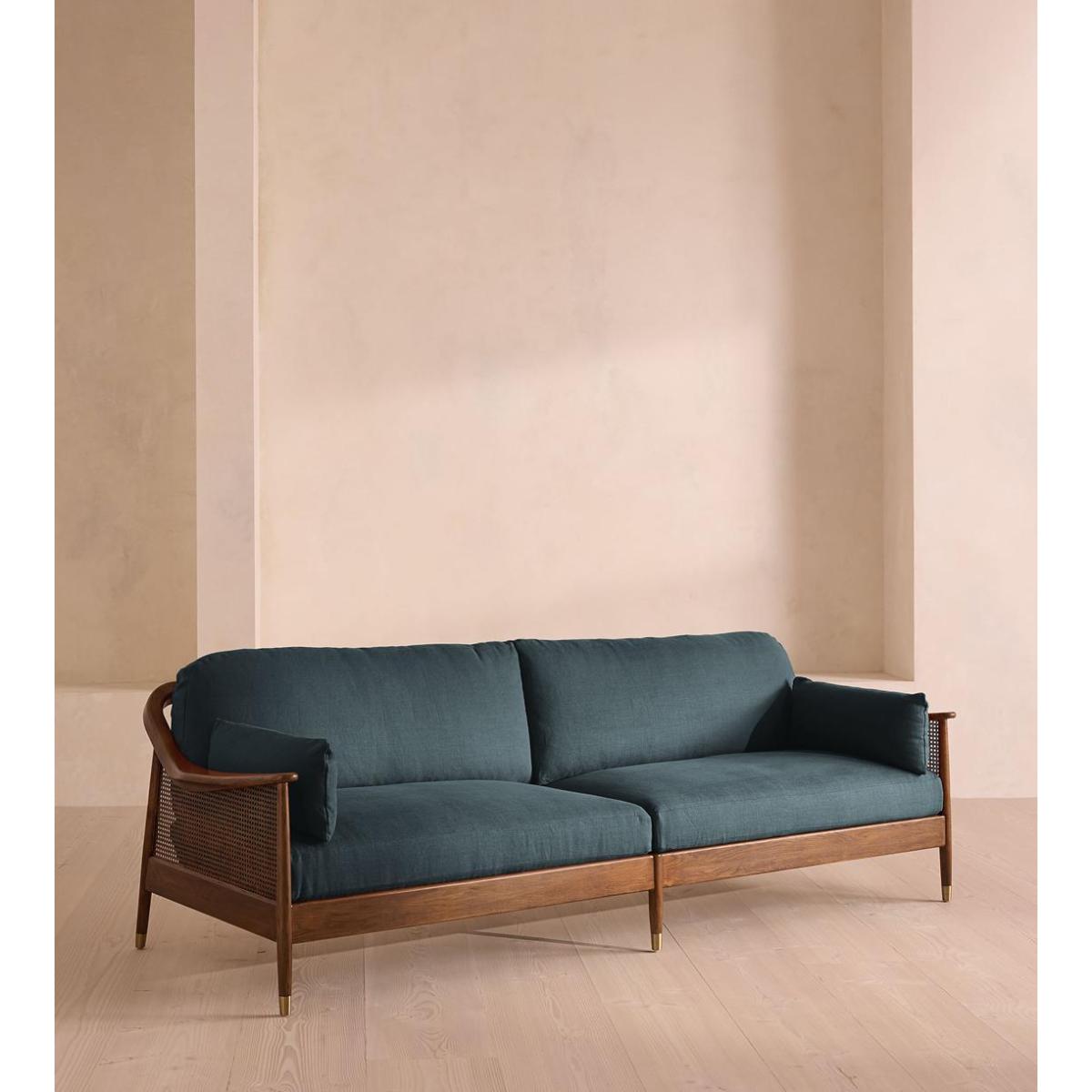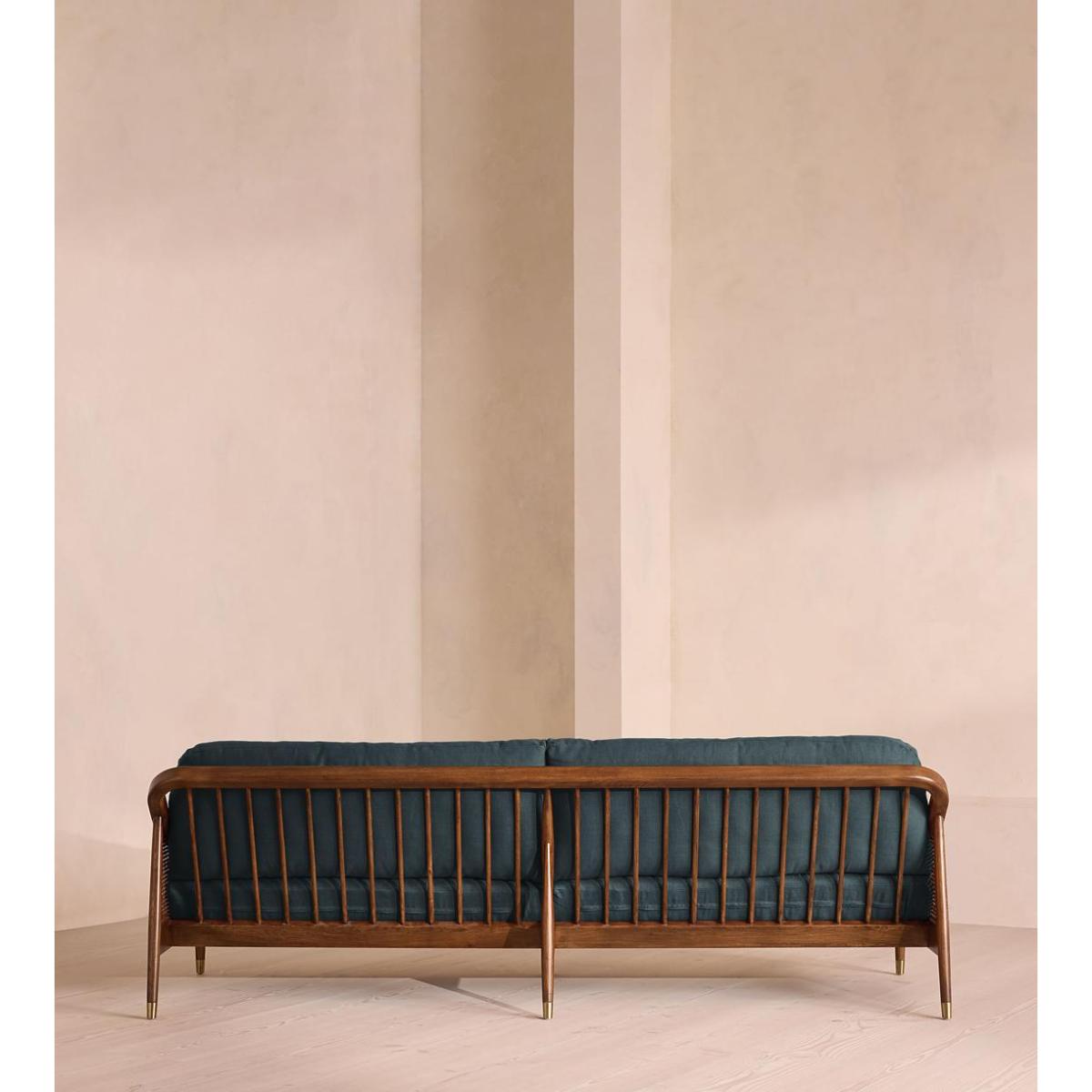Encased by rattan panelling on either side, a solid oak frame fitted with linen cushions is designed to seat up to four. The Atlanta four-seater sofa takes its inspiration from the design details seen throughout London's Shoreditch House. A solid oak frame finished with capped, antiqued brass feet and rattan panelling on either side is fitted with cushions wrapped in linen. Its upholstery is available in a range of bespoke shades.
