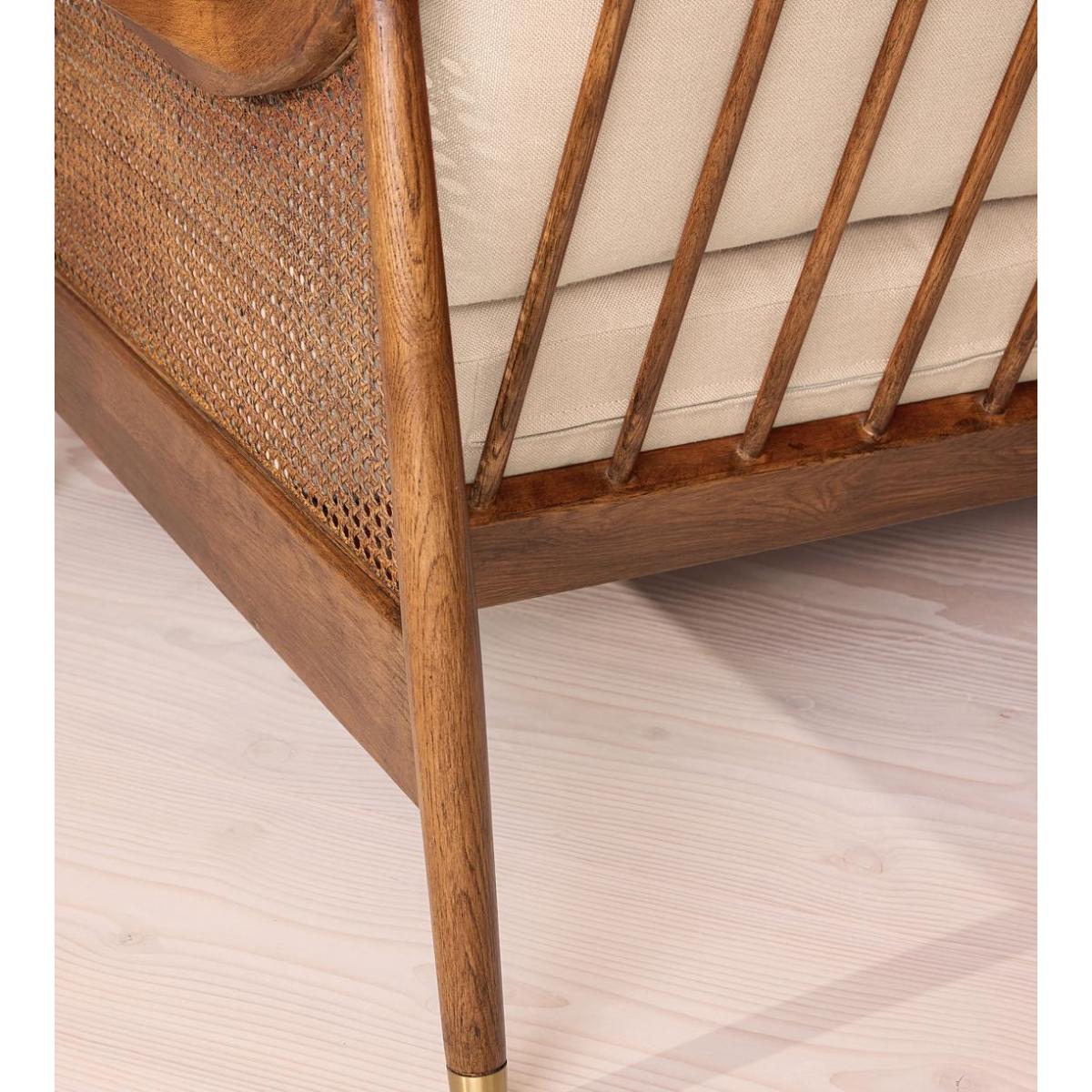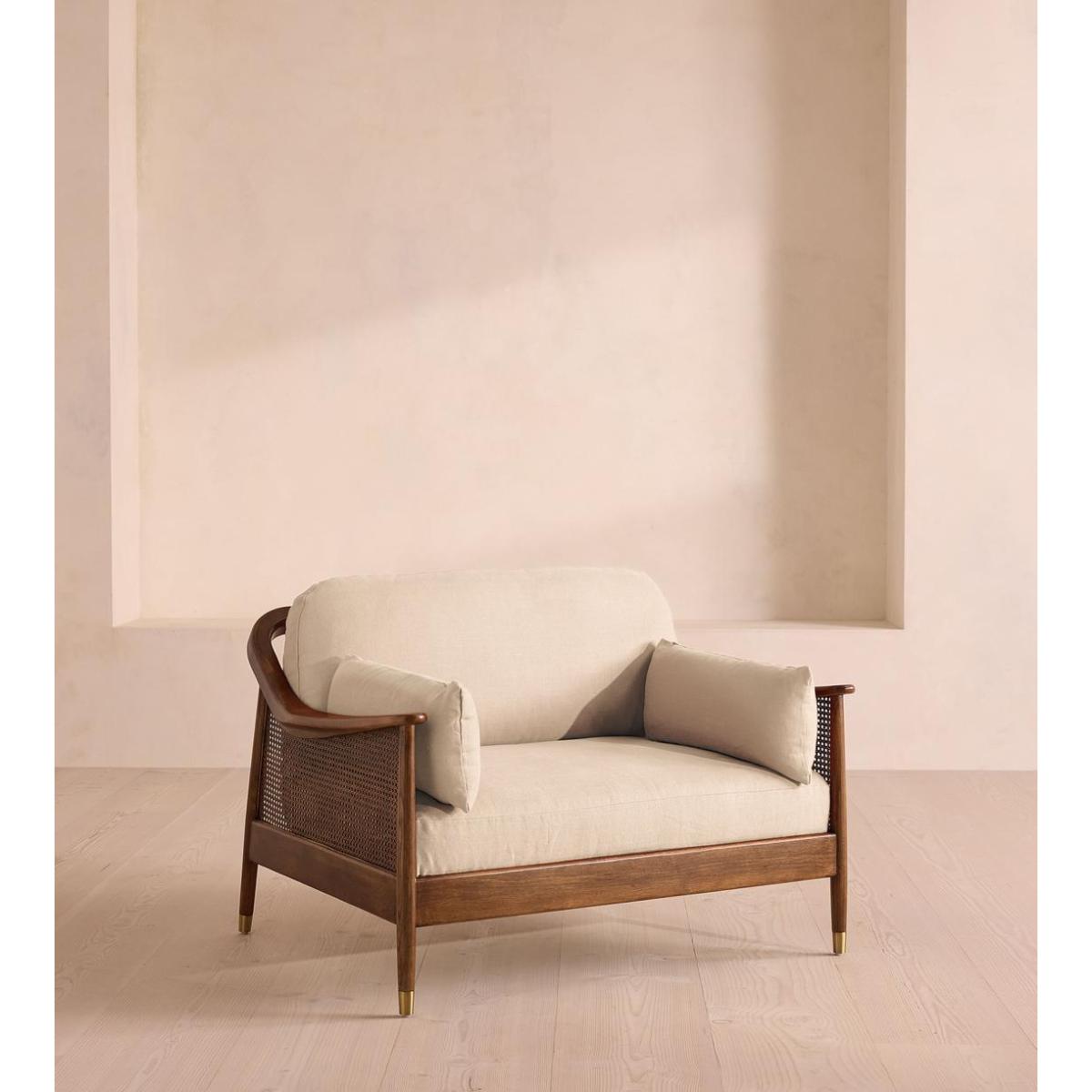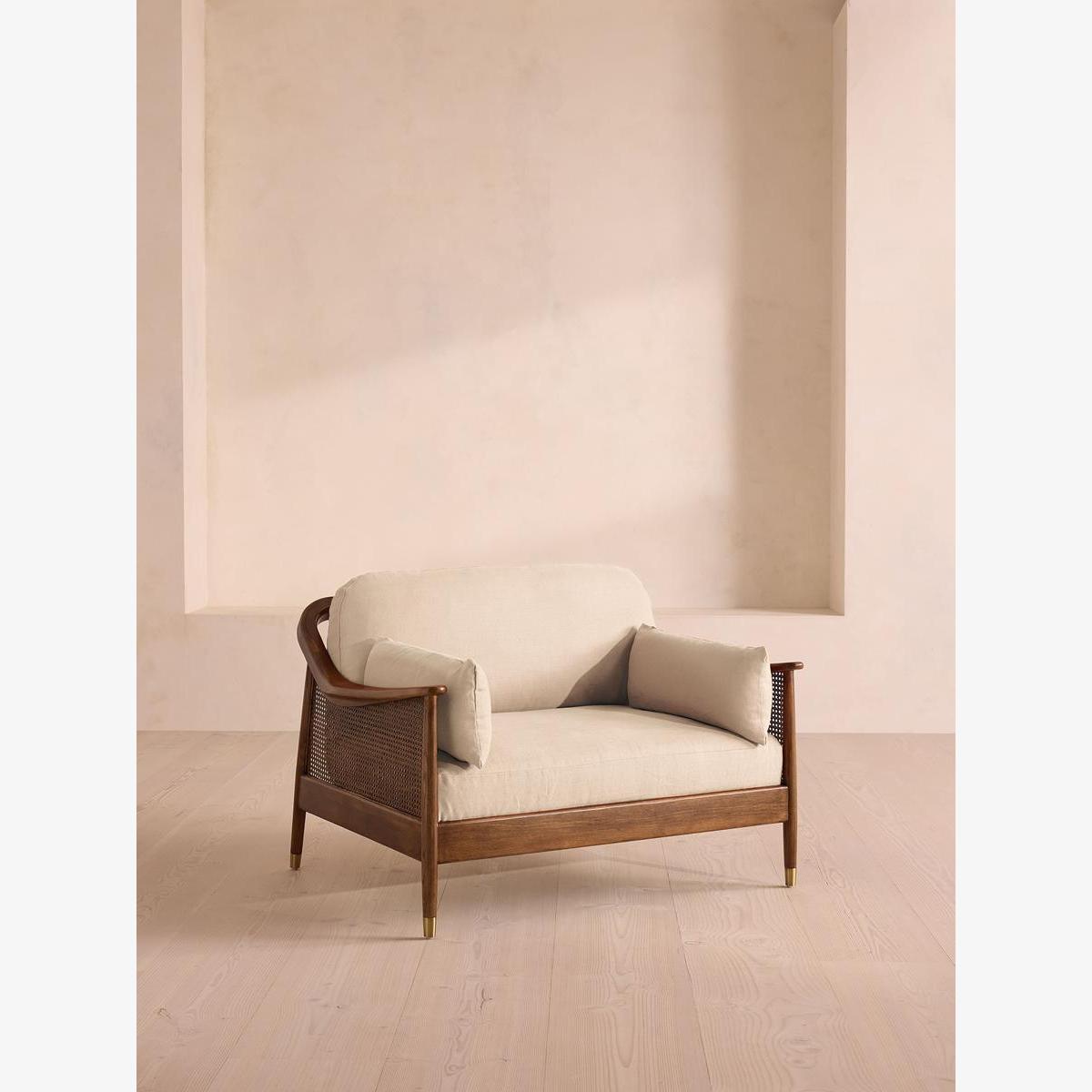 Encased by rattan panelling on either side, a solid oak frame fitted with linen cushions is designed to seat one or two. The Atlanta loveseat takes its inspiration from the design details seen throughout London's Shoreditch House. A solid oak frame finished with capped, antiqued brass feet and rattan panelling on either side is fitted with cushions wrapped in linen. Its upholstery is available in a range of bespoke shades.