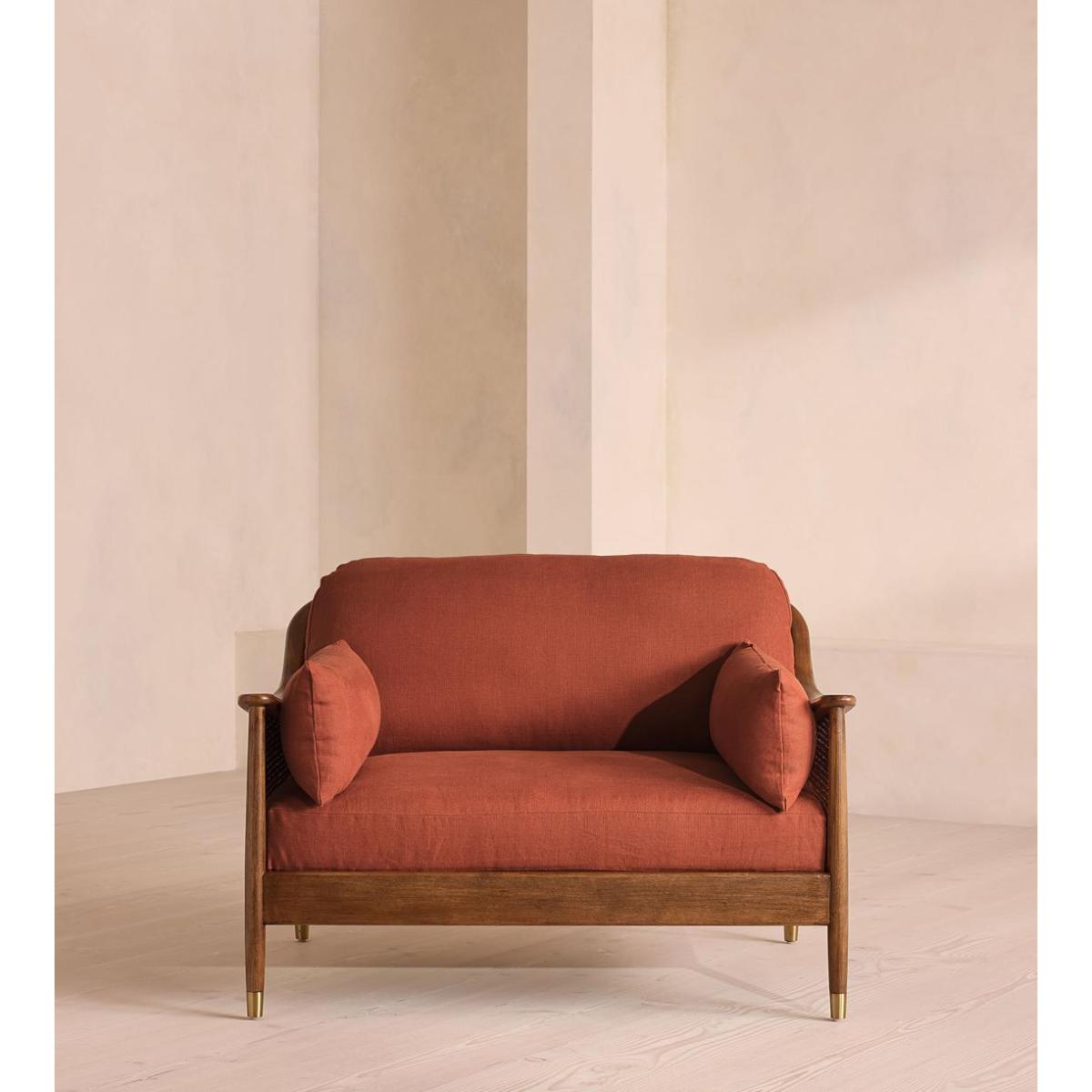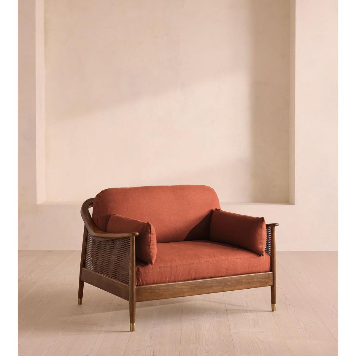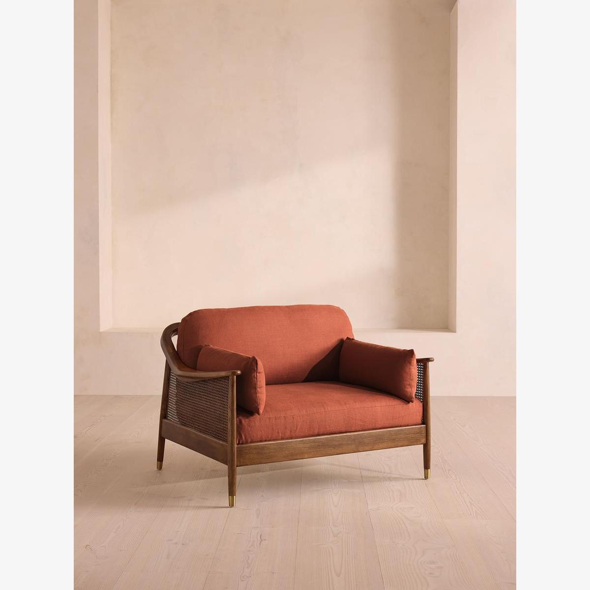 Encased by rattan panelling on either side, a solid oak frame fitted with linen cushions is designed to seat one or two. The Atlanta loveseat takes its inspiration from the design details seen throughout London's Shoreditch House. A solid oak frame finished with capped, antiqued brass feet and rattan panelling on either side is fitted with cushions wrapped in linen. Its upholstery is available in a range of bespoke shades.