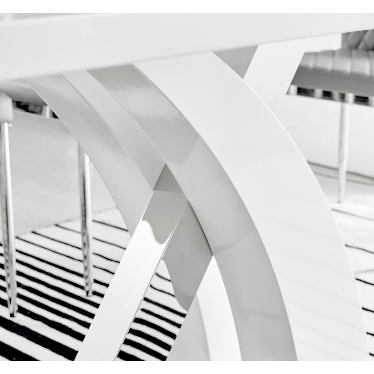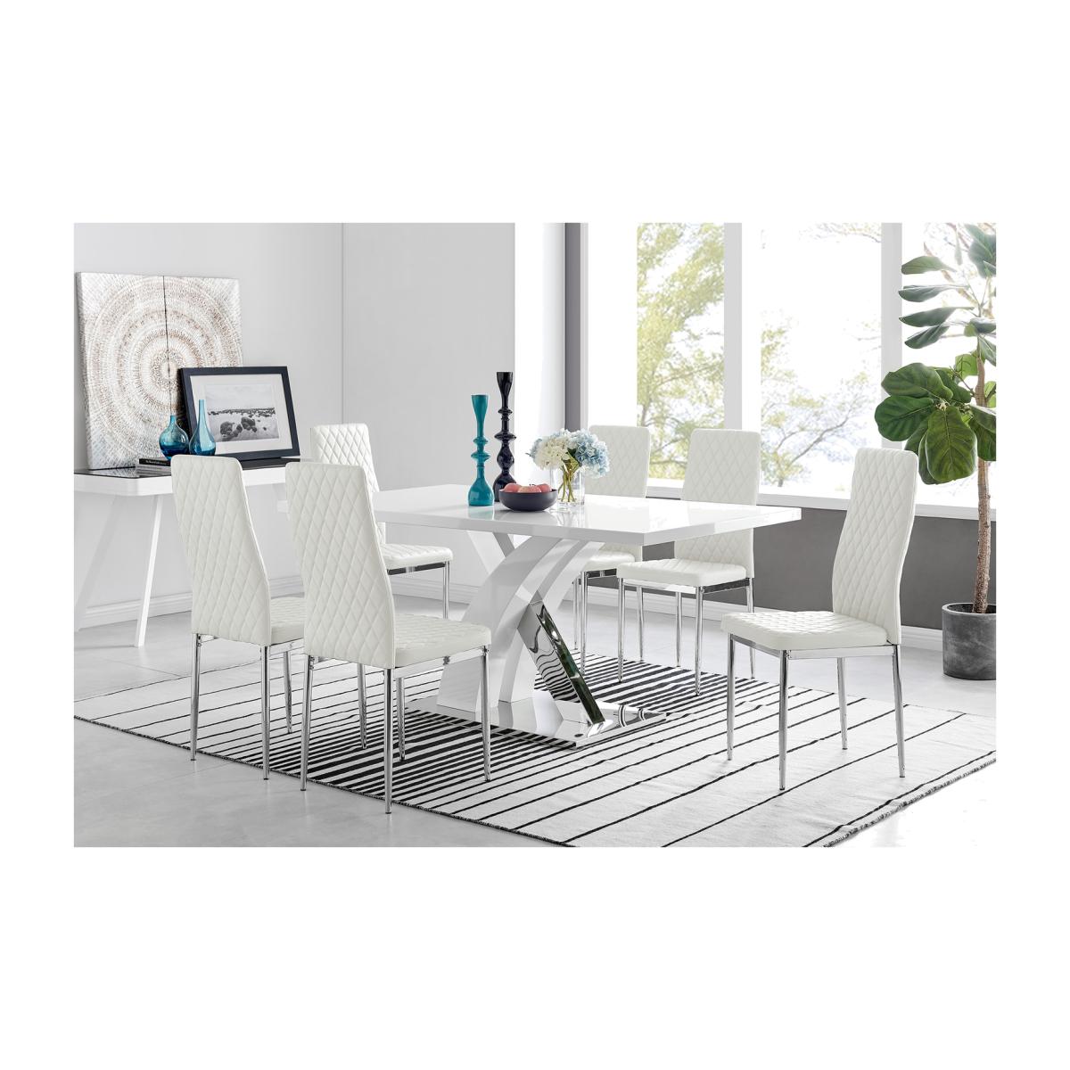 Strikingly elegant, the Atlanta dining set will light up any room! Coupling slick white high gloss and a beautifully crafted chrome metal base and diagonal support, the table really does make a statement. Generously offering a large 160cmx90cm top, made from wood with a smooth high gloss coating, the table allows plenty of room for dining with guests. Easy wipeclean surfaces also allow this table to look brand new for years to come!Paired alongside our beautiful faux leather diamond quilted Milan chairs, you can't go wrong with this set. The chairs are made from high quality faux leather and are ergonomically designed for maximum comfort and support. They feature soft touch faux leather with a deep foam seat cushion and plastic feet to protect the floor from any damage! With a real designer look alongside a feeling of luxury, just without the expensive price tag, this set is perfect for any dining space.