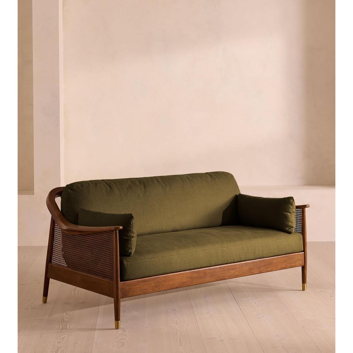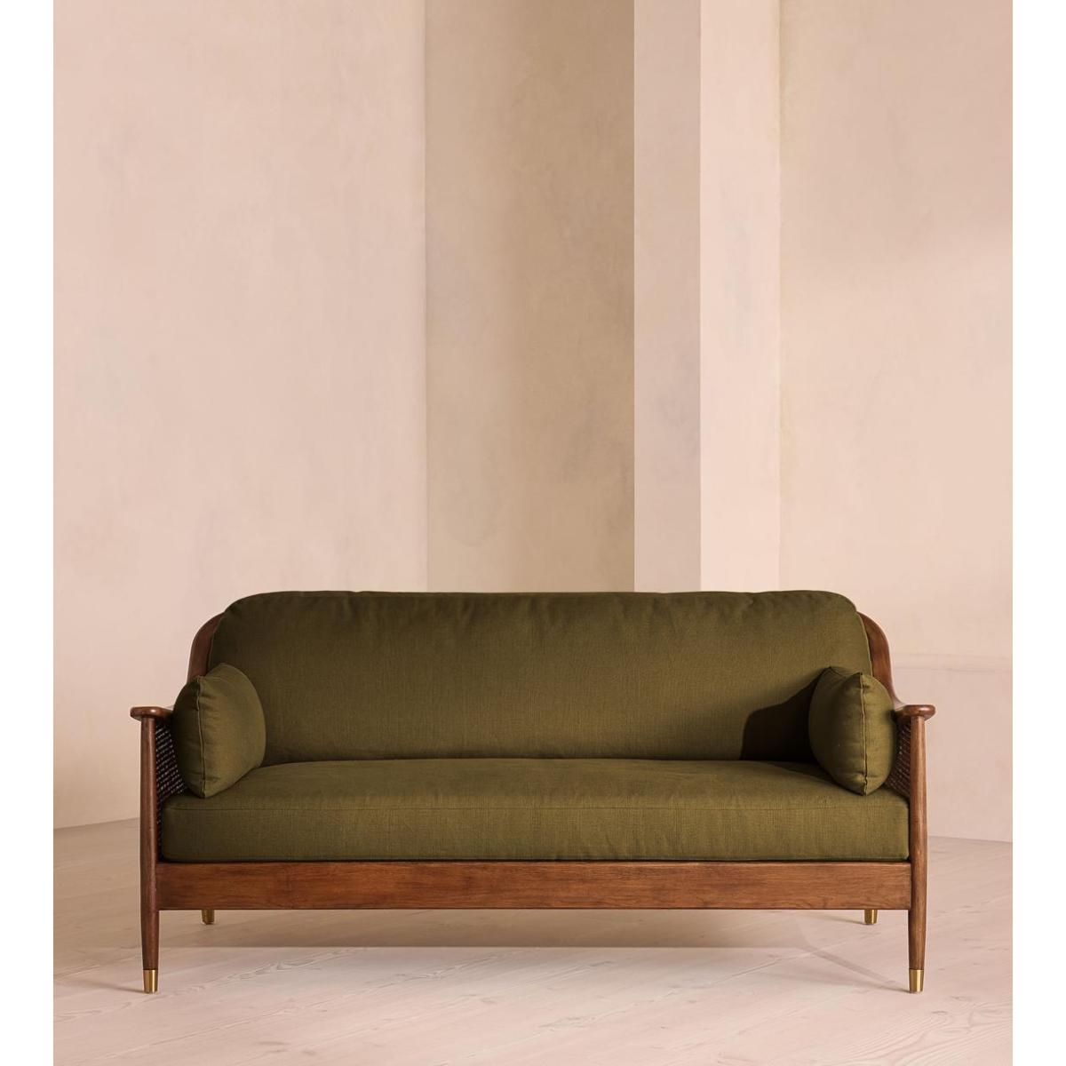 Encased by rattan panelling on either side, a solid oak frame fitted with linen cushions is designed to seat up to three. The Atlanta three-seater sofa takes its inspiration from the design details seen throughout London's Shoreditch House. A solid oak frame finished with capped, antiqued brass feet and rattan panelling on either side is fitted with cushions wrapped in linen. Its upholstery is available in a range of bespoke shades.
