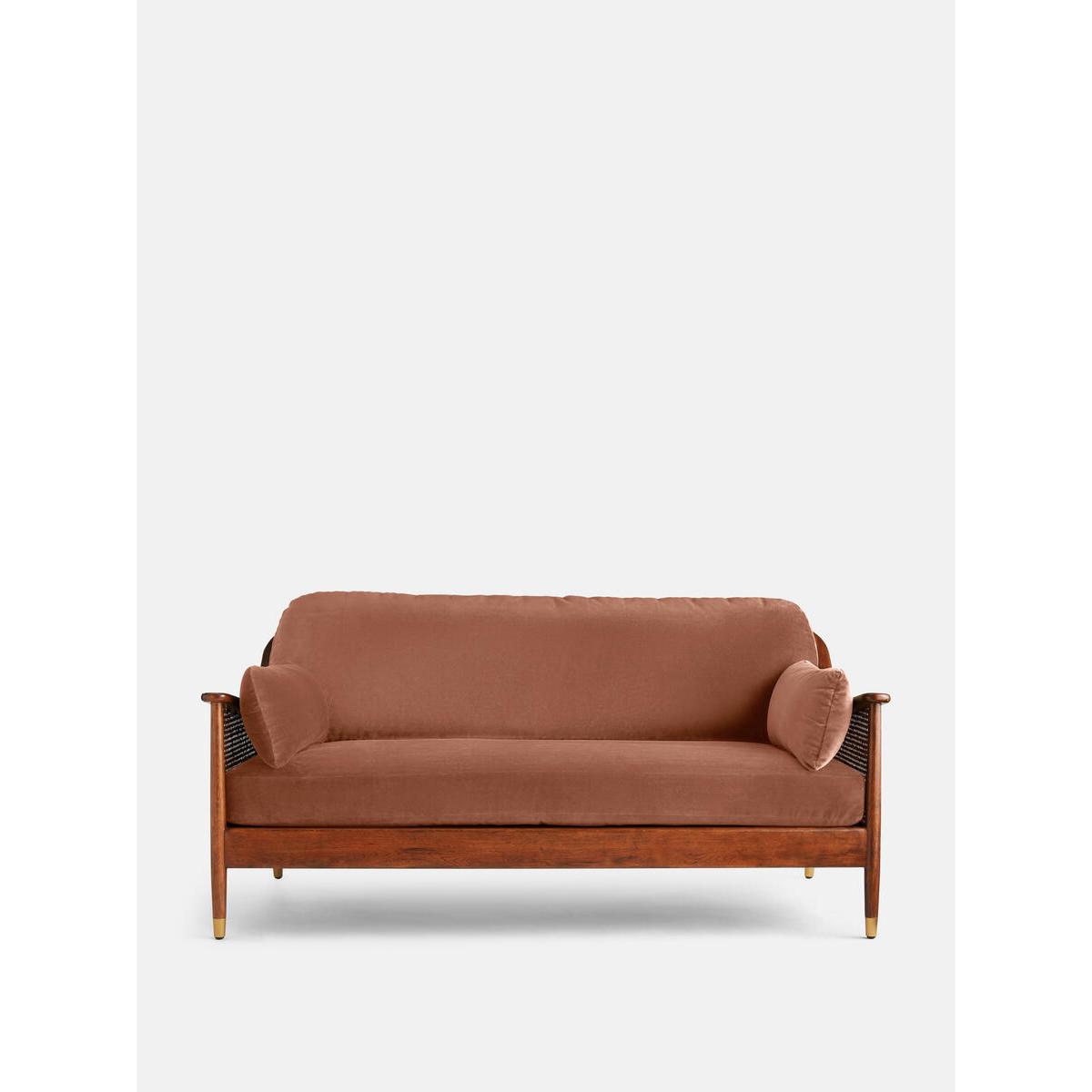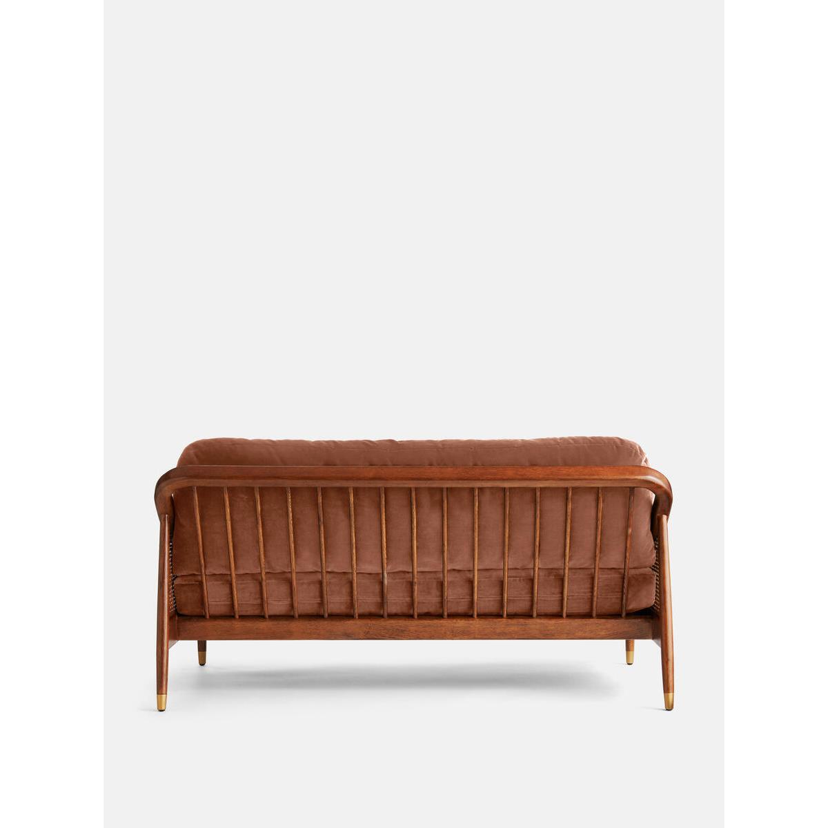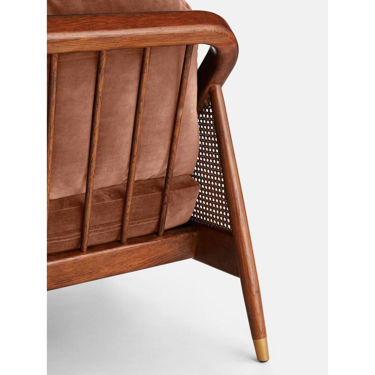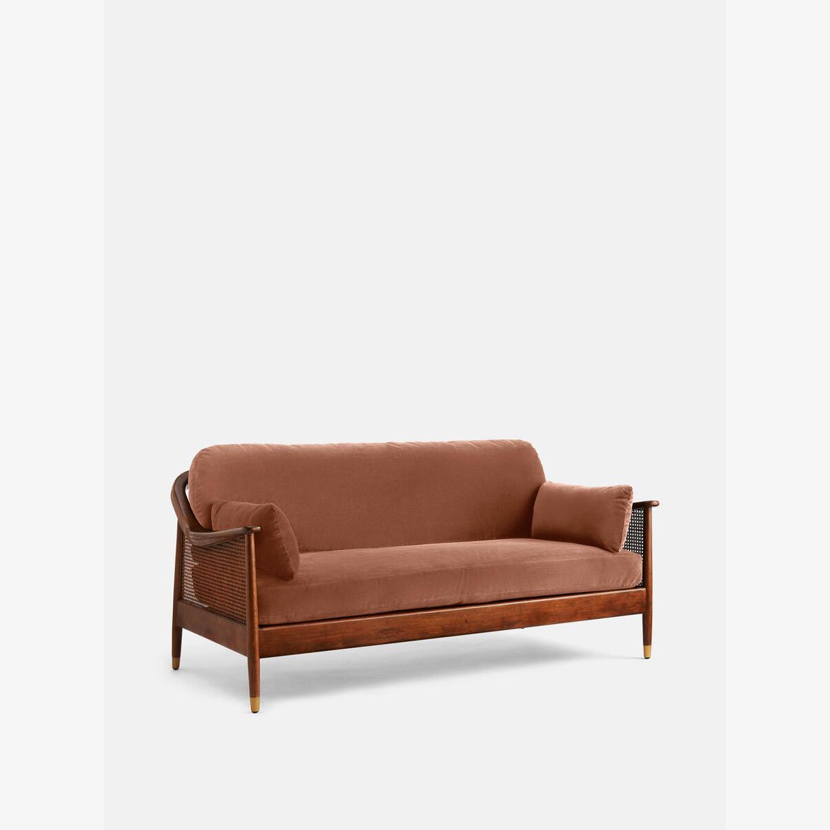 The Atlanta three-seater sofa has been upholstered in velvet for a rich depth of color and texture. A solid oak frame and natural rattan paneling play with contrasting textures, while a spindle back, capped feet and antique brass detail echo the styles seen throughout Shoreditch House. Solid oak three-seater sofa Upholstered in velvet Natural rattan paneling Antique brass detailing Capped feet Comes in other sizes Available in other fabrics Inspired by Shoreditch House