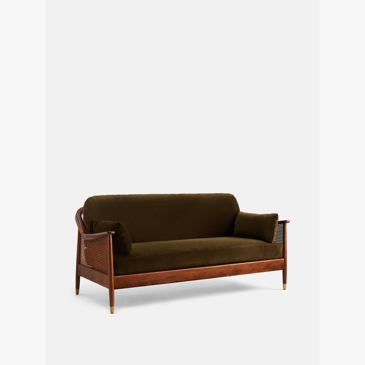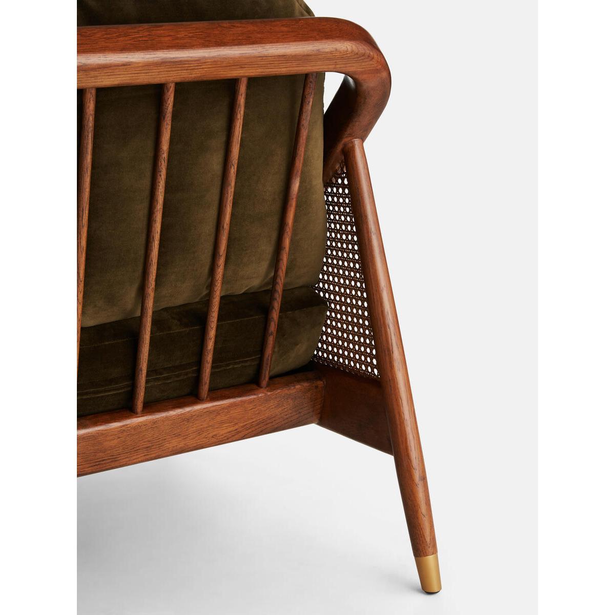 The Atlanta three-seater sofa has been upholstered in olive green velvet for a rich depth of colour and texture. A solid oak frame and natural rattan panelling play with contrasting textures, while a spindle back, capped feet and antique brass detail echo the styles seen throughout Shoreditch House. Solid oak three-seater sofa Upholstered in velvet Natural rattan panelling Antique brass detailing Capped feet Comes in other sizes Available in other fabrics Inspired by Shoreditch House