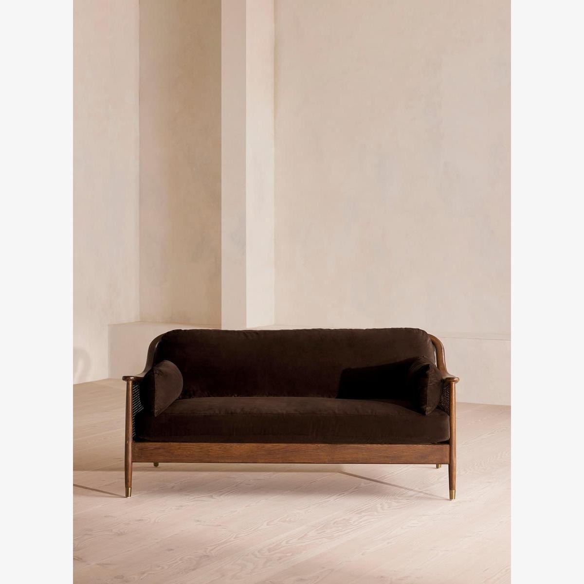 Encased by rattan panelling on either side, a solid oak frame fitted with velvet cushions is designed to seat three people. The Atlanta three-seater sofa takes its inspiration from the design details throughout London's Shoreditch House. A solid oak frame finished with capped, antiqued brass feet and rattan panelling on either side is fitted with cushions wrapped in velvet. Available in a range of bespoke shades, the upholstery is specifically chosen to add a rich depth to the colour.