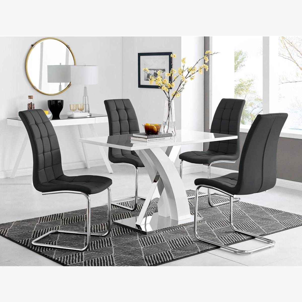 Strikingly elegant, the Atlanta dining set will light up any room! Coupling slick white high gloss and a beautifully crafted chrome metal base and diagonal support, the table really does make a statement. Generously offering a 120cm x 70cm top, made from wood with a smooth high gloss coating, the table allows plenty of room for dining with guests. Easy wipeclean surfaces also allow this table to look brand new for years to come! The smooth contours of the hatched pad and the single seat design combine to create a flowing feel to the Murano chair. It is shaped to offer maximum ergonomic support, whilst the deep foam cushion makes it delight to sit on. Both inviting and sumptuous, the Murano is sure to be a strong contender in your quest for the right dining chair.