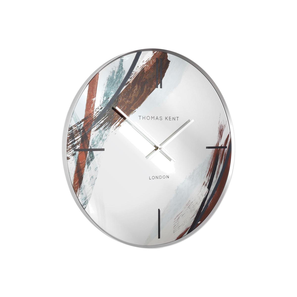 A bold abstract design in an on-trend colour palette makes this wall clock a fabulous choice for any modern interior. Its mirrored face and silver accents give it a touch of glam style. Why you'll love it. This large round wall clock is a statement piece for any room. Contemporary glam style. Abstract brushstroke pattern in red and blue evokes ocean waves. Curved mirrored face. Slender silver-effect hands and silver foil frame. By Thomas Kent. This round wall clock is part of the Furniture Village home accessories collection. What you need to know. For indoor use only. Requires 1 x AA battery, not included. Dimensions. Diameter: 69 cm (28 in).