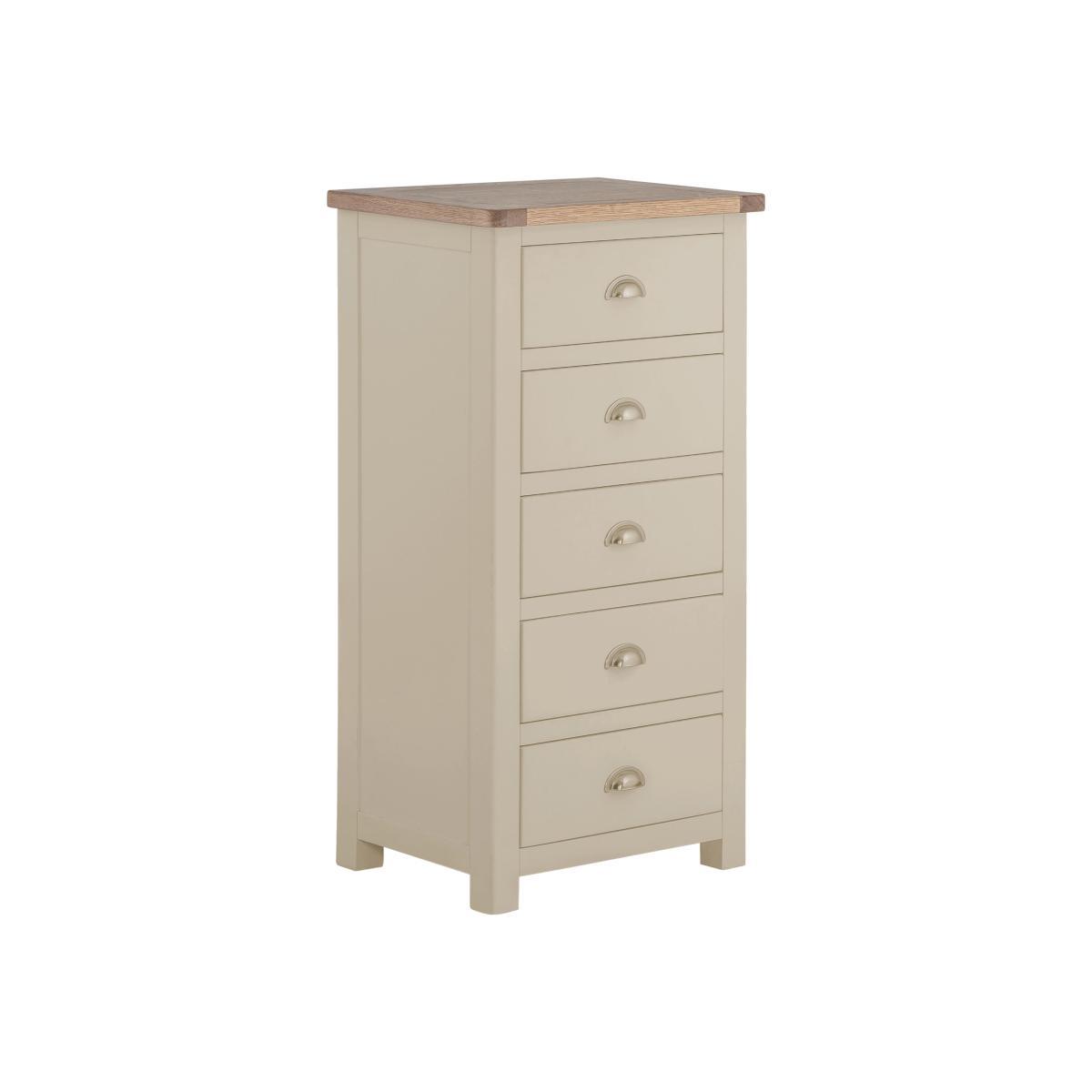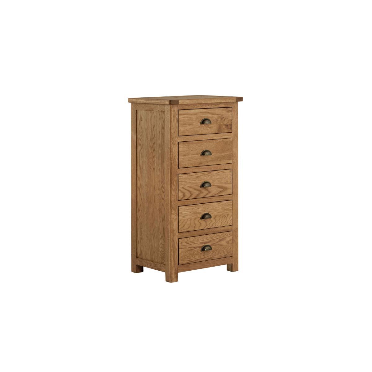 The fantastic-value Atlantic bedroom furniture collection ticks all the boxes. It’s beautifully crafted from solid oak and oak veneer. Pieces have clean lines and slim proportions so they suit smaller as well as larger bedrooms. It’s very functional – you’ll find roomy drawers, spacious hanging spaces and overhanging tops that maximise display space. And the details are lovely, too, from the antique-finish cup handles to the smoothly rounded corners. Timeless in style, this is a fabulous range for all bedrooms and, thanks to the incredible prices, all budgets. High-quality oak bedroom furniture at a fantastic value-price. Huge choice of pieces makes creating the perfect bedroom so easy. A timeless look with spacious storage and lovely finishing touches. If you love classic oak furniture and your bedroom is on the smaller side, take a look at the fantastic value Atlantic 5 drawer tall chest. This neatly-proportioned chest of drawers is tall rather than wide which means you’ll enjoy plenty of storage space without losing too much floor space. You’ll also enjoy some lovely design features, too. Carefully constructed from solid oak and oak veneer, this sturdy chest of drawers has unfussy clean lines, panelled-effect sides and top, rounded corners and an overhanging top surface. Antique-effect metal cup handles adorn each of the five drawers. The Atlantic 5 drawer tall chest is part of the fantastic Atlantic bedroom furniture collection. Offering a wide range of pieces which showcase slim proportions alongside roomy storage spaces, this solid oak and oak veneer range includes several chests of drawers, wardrobes and bed frames as well as a dressing table and blanket box. The perfect timeless finish for almost any style of bedroom, the Atlantic 5 drawer tall chest represents truly amazing value. WARNING!. Furniture can tip over unexpectedly and cause injury. This item shall be fixed to a wall using the anti-tip kit provided with the furniture. Be sure to use the correct wall fixings suitable for the walls in your home. Did you know?. Natural wood has unique markings and shows colour variation.