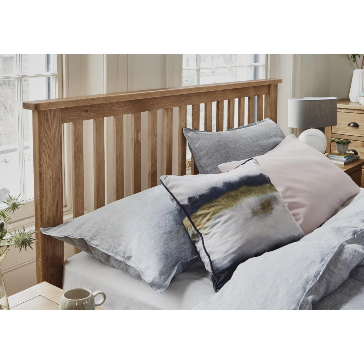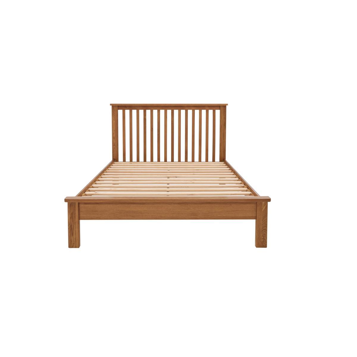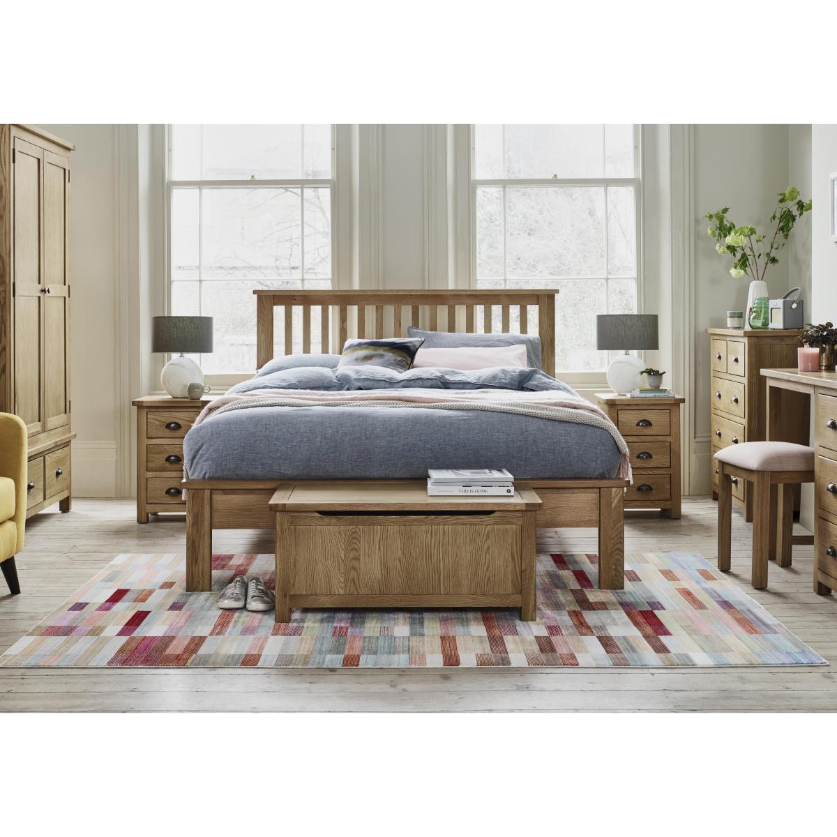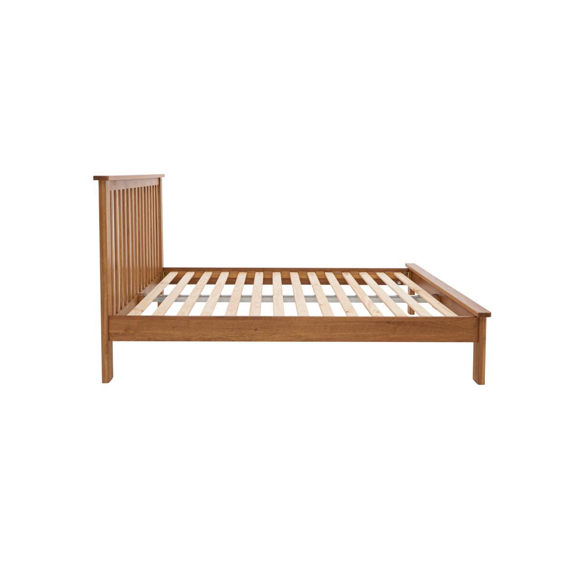 High- quality oak bedroom furniture at a fantastic- value price Huge choice of pieces makes creating the perfect bedroom so easy Classic wooden bed frame has stylish slatted headboard Bring home the timeless look of oak bedroom furniture at a fantastic- value price with the Atlantic bed frame. Beautifully made in solid oak and oak veneer, this classic- style bed frame makes a handsome focal point in any bedroom thanks to its square- edged slatted headboard. Its slim profile also works perfectly in all shapes and sizes of bedroom. Its available in single, double and king bed sizes. The base has solid slats and is suitable for any type of standard mattress. The Atlantic bed frame is part of the extensive Atlantic oak bedroom furniture collection at Furniture Village. Perfect for both small and large bedrooms, the collection offers a wide choice of chests of drawers, wardrobes and bed frames as well as charming pieces like a dressing table and a blanket box. Thoughtful design, functional features and fabulous high- quality wood construction and all at an amazing price. Did you know? Natural wood has unique markings and shows colour variation.