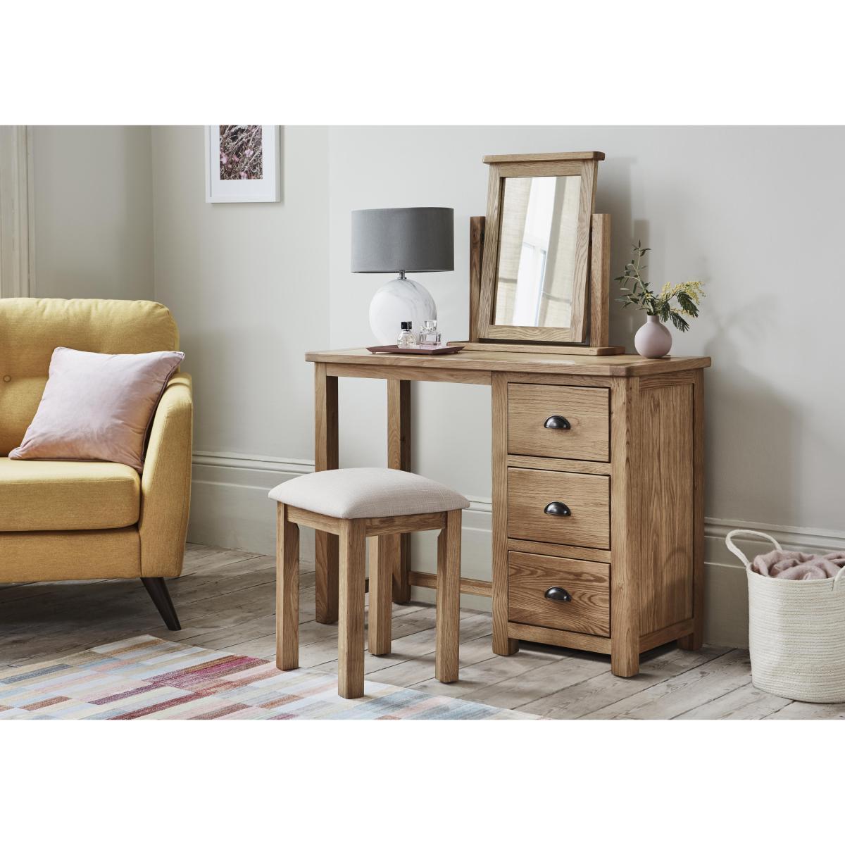 The fantastic-value Atlantic bedroom furniture collection ticks all the boxes. It’s beautifully crafted from solid oak and oak veneer. Pieces have clean lines and slim proportions so they suit smaller as well as larger bedrooms. It’s very functional – you’ll find roomy drawers, spacious hanging spaces and overhanging tops that maximise display space. And the details are lovely, too, from the antique-finish cup handles to the smoothly rounded corners. Timeless in style, this is a fabulous range for all bedrooms and, thanks to the incredible prices, all budgets. High-quality oak bedroom furniture at a fantastic value price. Huge choice of pieces makes creating the perfect bedroom so easy. A timeless look with lovely finishing touches. Here’s the perfect finishing touch for your stylish bedroom. Suspended within a frame and set on a plinth, the great-value Atlantic dressing table mirror rests on any dressing table top or chest of drawers. It pivots within its frame which is very handy when you’re applying makeup or fastening jewellery. This classic-style mirror is crafted from solid oak and oak veneer that has a lovely warm-toned hue, and is designed to pair with the Atlantic dressing table. It may be fixed to a dressing table or left freestanding so you can move it from surface to surface. The frame itself is neatly square-edged and features a broader horizontal top rail – a lovely finishing touch. The Atlantic dressing table mirror is part of the extensive Atlantic bedroom furniture collection at Furniture Village. As well as the dressing table, the collection includes three styles of wardrobes, three sizes of bed frame, chests of drawers and a blanket box. Timeless oak bedroom furniture that’s truly fantastic value. Did you know?. Natural wood has unique markings and shows colour variation.