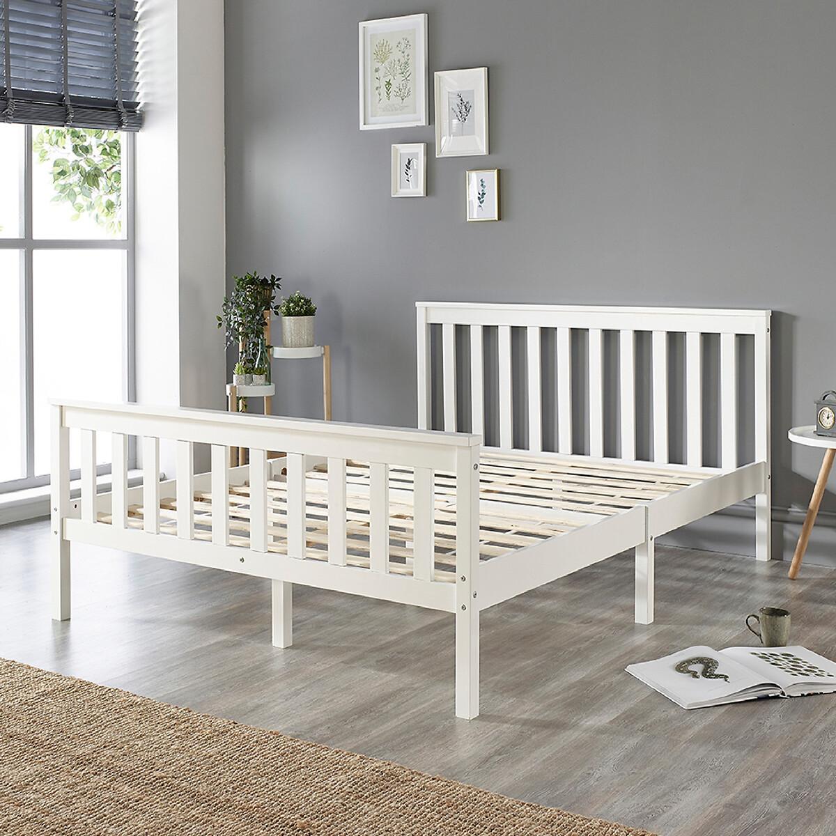 Please note: this product cannot be delivered to all Offshore Islands, Northern Ireland or Republic of Ireland. A timeless shaker design bed in a painted white finish with natural wood accents which is sure to fit both modern and classic interiors-Beautiful, Shaker style design-Made of pine wood-Slatted headboard and footboard-20cm clearance under the bed-Compatible with standard UK size mattresses.-Supplied flat packed-Straightforward self assembly, no tools required 2 people makes installation easier.-Slats are included. Product Dimensions: -Single:198cmx98cmx82cm Weight: 18.4kg-Small Double:198cmx128cmx82cm Weight: 23.9kg-Double:198cmx143cmx82cm Weight: 24.5kg-King:208cmx158cmx82cm Weight: 27.8kg-Super King:208cmx188cmx82cm Weight: 33.9kg. Please remember to measure your available space before ordering. Packaged Dimensions:Single: 102cmx31cmx17cm Weight: 19kg. Small Double: 132cmx31cmx16cm Weight: 25kg. Double: 149cmx31cmx16cm Weight: 25kg. King: 162cmx31cmx15cm Weight: 29kg Super King:Parcel 1: 192cmx24cmx13cm Weight: 22kg Parcel 2: 105cmx27cmx14cm Weight: 13kg. This product will be dispatched by one of our trusted suppliers. You’ll be contacted by their selected courier about your delivery. ASPIR01