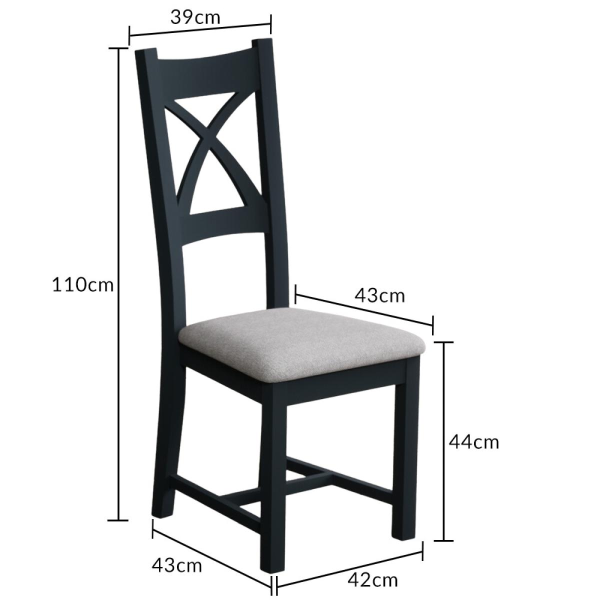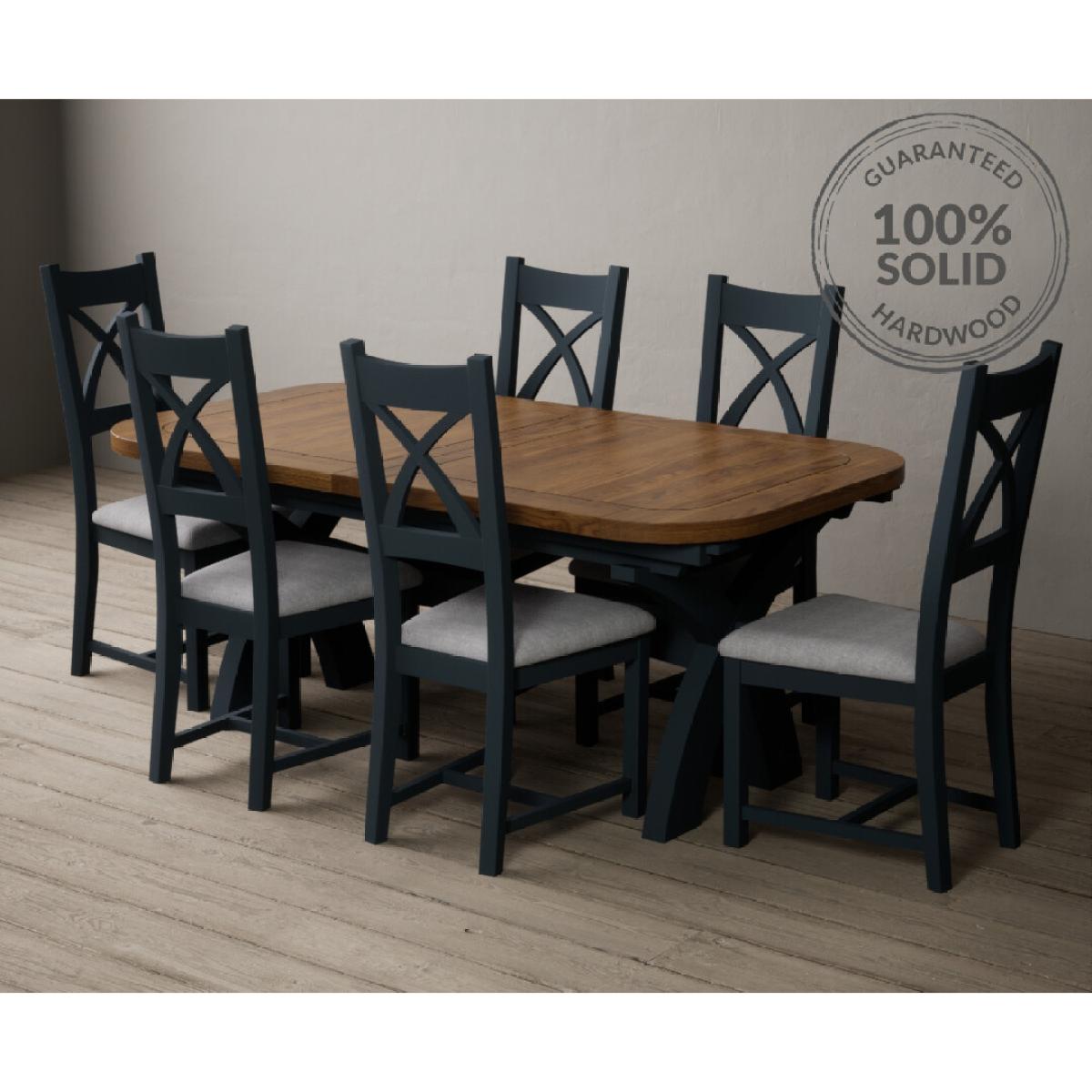 The Atlas 180cm Oak and Dark Blue Extending Dining Table with X Back Chairs is a solid extending dining table with matching solid wood chairs.