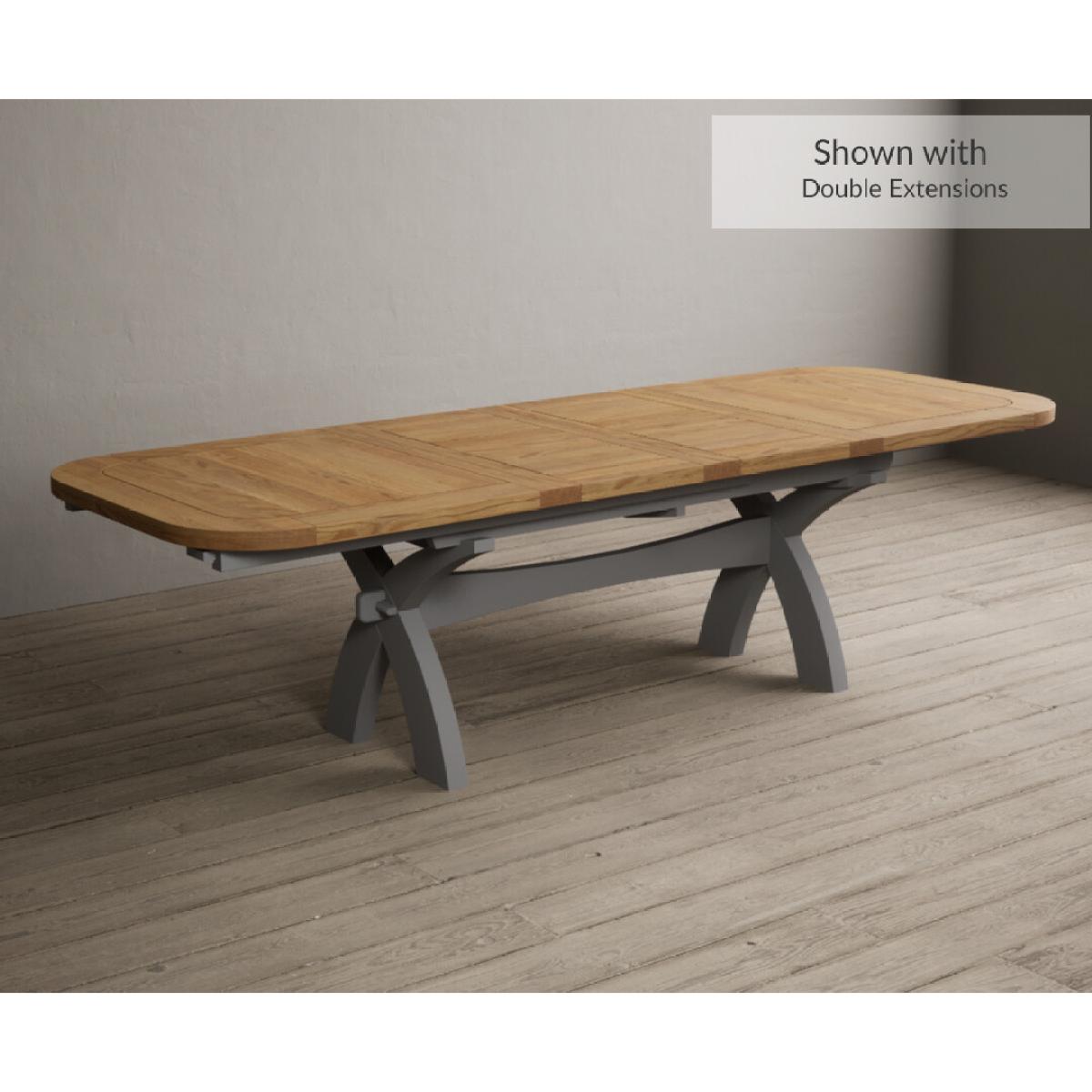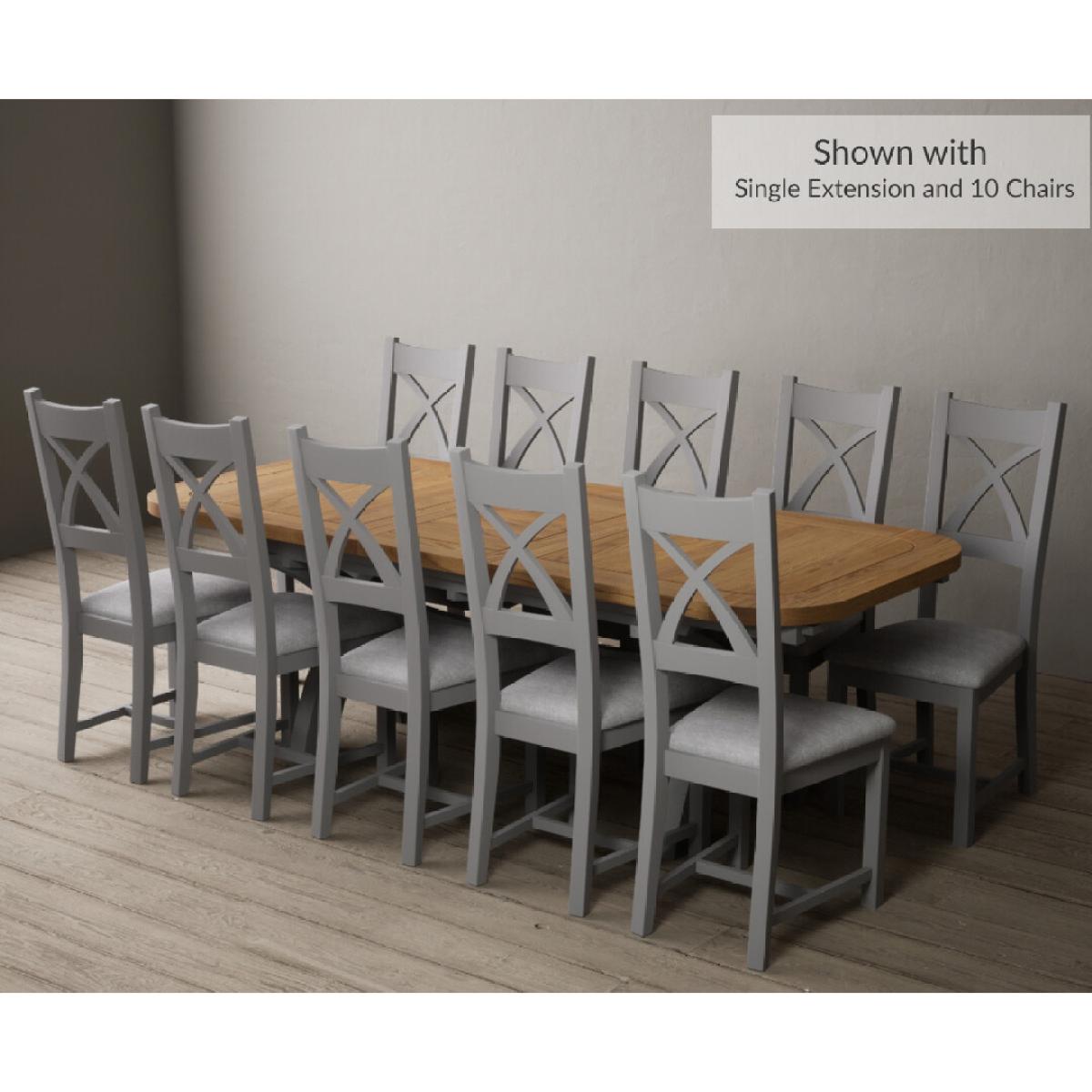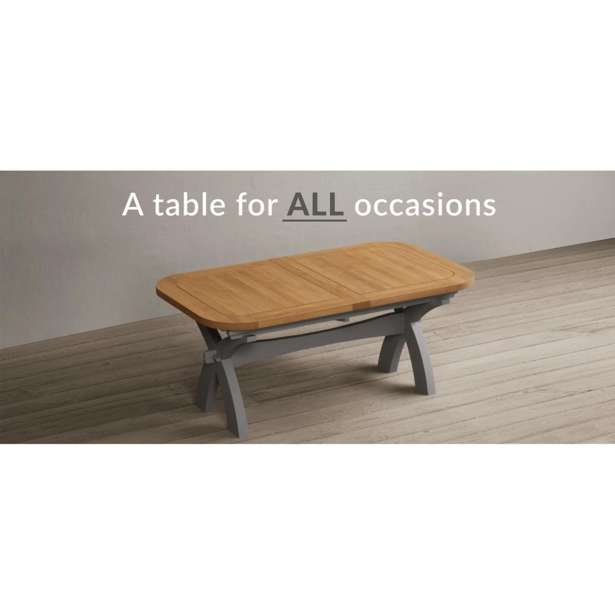 This dining set strikes a great balance between practicality and style, making it versatile for various interiors. The mix of the oak and light grey painted finish gives it a contemporary look that works well in modern, Scandi, or transitional spaces. I love how the extension feature allows flexibility for larger gatherings, making it perfect for entertaining. Style-wise, pairing it with soft neutral tones or adding colourful accessories like cushions, placemats, or feature pendant lighting can really elevate the look. The light grey chairs with their X-back design are not only timeless but also add a touch of elegance, ensuring the set looks inviting yet sophisticated. It’s well-suited to open-plan kitchens or dining rooms aiming for a clean, fresh aesthetic. Practical tips include using a table runner or protective pad - especially when extending - to keep the oak looking its best.