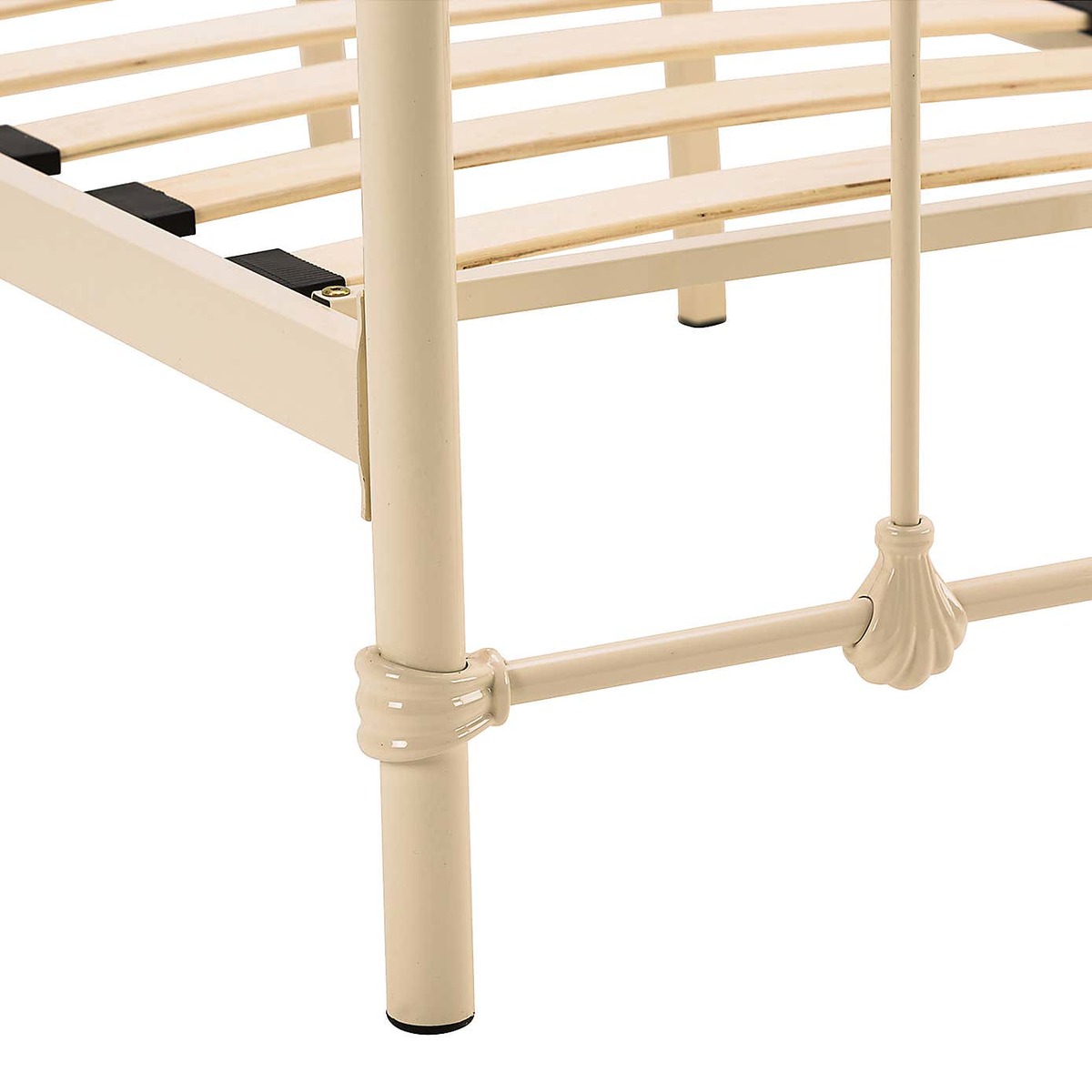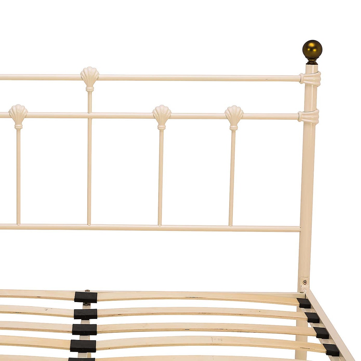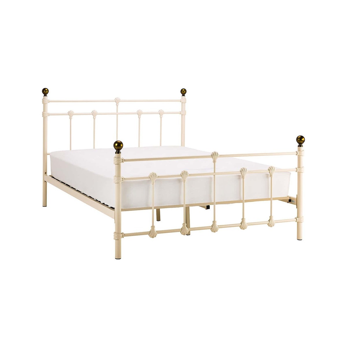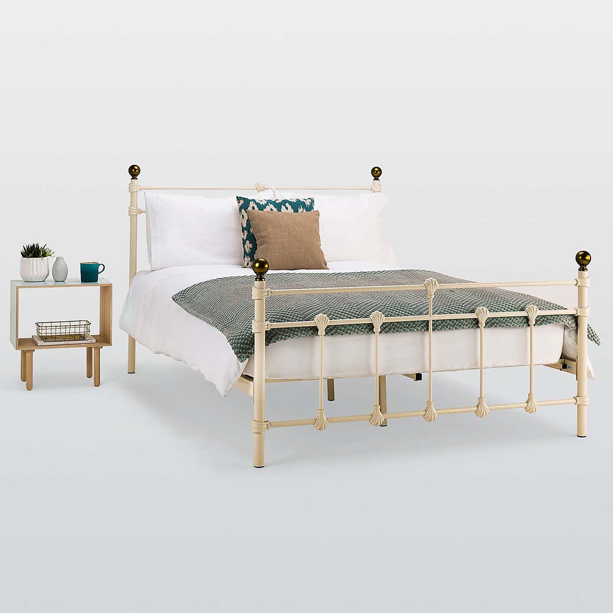 * Stylish abstract metal construction with antique brass finials* Sprung slatted base- for added support and comfort* Stunning detailed headboard and high footboard The Atlas Bed Frame has been beautifully crafted from metal for a stunning detailed finish. This traditional-style bed frame is finished in a choice of cream or black, depending on the look you're going for. The antique brass finials add charm and character, whilst the sprung slatted base will give you a restful sleep night after night. Please note, unfortunately we cannot deliver this item to the Channel Islands.