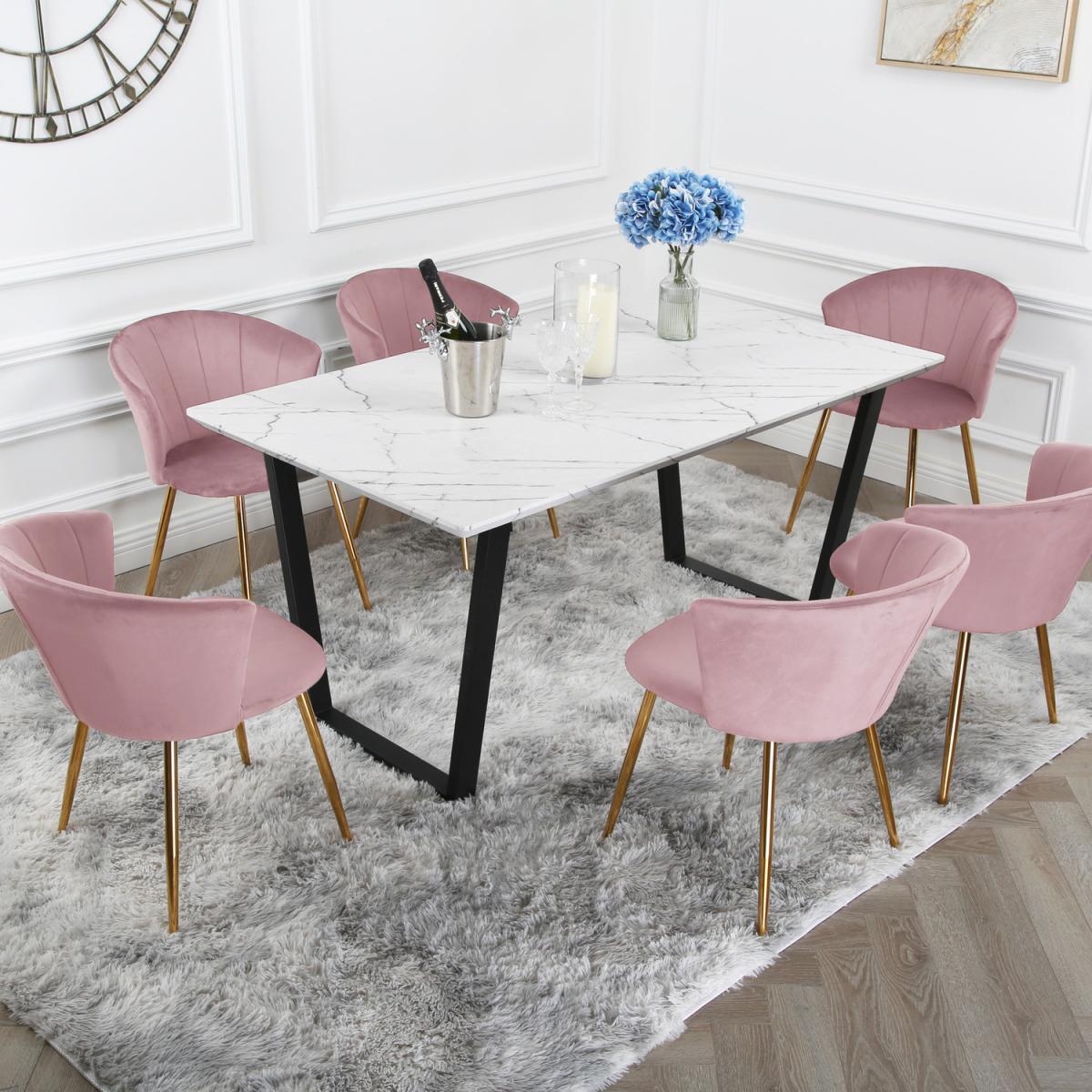 With its spectacular Atlas marble-effect table and six velvet chairs, the Atlas dining table set represents the pinnacle of elegance and comfort. This six-seater dining set is intended to add elegance and sophistication to your kitchen or living area. With the Atlas dining table, contemporary dining reaches new heights. Its elegant design is a lovely blend of contemporary luxury and industrial elegance. The table's faux-marble tabletop, which is discreetly adorned with natural veining, exudes opulence. In contrast to the sturdy yet refined black powder-coated steel frame, the Atlas table stands out and elicits admiration. The Atlas dining table is constructed with a modern black metal frame that is supported by slender legs and exemplifies exceptional architectural skill. This architectural beauty attracts conversation and functions as the focal point of any dining or kitchen space. The Atlas blends seamlessly with open, bright spaces and adapts to a variety of locations. The Hamilton velvet dining chairs give the Atlas table a touch of contemporary luxury. The backrest of the Hamilton chairs is slightly curved and meticulously stitched to provide ergonomic support without sacrificing style. The luxurious texture of the plush velvet fabric provides comfort during prolonged mealtimes.